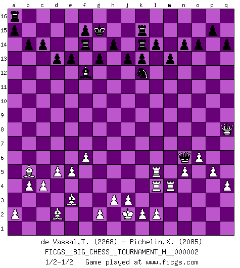 Last move : 1/2-1/2 2009 August 23 13:59:49 [Event "FICGS__BIG_CHESS__TOURNAMENT_M__000002"] [Site "FICGS"] [Date "2009.04.14"] [Round "1"] [White "de Vassal,Thibault"] [Black "Pichelin,Xavier"] [Result "1/2-1/2"] [WhiteElo "2268"] [BlackElo "2085"] 1.j2-h4 g15-g14 2.b1-c3 p16-o14 3.m2-m4 m15-m13 4.n2-n4 l16-o13 5.o2-o4 n15-n14 6.h1-o7 j15-k13 7.e2-e4 c15-c14 8.g1-f3 h16-m12 9.p1-o3 d15-d13 10.f1-b5 l15-l14 11.l1-m2 o16-k12 12.d2-d4 f16-g15 13.m2-g7 k12-l11 14.g7-h6 c16-k9 15.h2-j4 o14-p12 16.o4-o5 o15-o14 17.k1-l3 b16-d15 18.o3-n5 g15-e13 19.o1-f9 g16-j15 20.l3-k5 d15-f14 21.f3-g5 o13-m11 22.c3-e2 j15-h13 23.c2-c4 h13-j11 24.f2-f4 m11-l10 25.o7-b7 b15-b14 26.c1-d2 f14-g12 27.d2-a5 j14-j13 28.e4-e5 p12-n13 29.e2-g3 h15-f14 30.j4-l5 m16-m15 31.g3-j4 k16-j14 32.b7-a7 l11-j9 33.p2-p4 j16-h15 34.j1-j2 f14-h13 35.q2-q4 e13-f12 36.a7-a8 g12-h10 37.f9-c6 e15-e13 38.p4-p5 e16-e14 39.m1-m3 e14-f14 40.f4-f5 n13-l12 41.n5-l6 h10-j8 42.h6-j5 m12-m11 43.a8-a12 j9-k10 44.l5-n6 l10-k11 45.a1-d1 k13-h12 46.g5-j6 j8-l9 47.k5-l7 k9-j10 48.a12-a9 l9-k7 49.j5-k4 k10-j9 50.d4-d5 k7-m6 51.e1-n1 m15-n15 52.j4-l5 j11-l10 53.o5-o6 l12-k10 54.n4-n5 m6-l8 55.f5-f6 h13-j11 56.c6-e8 j11-k9 57.h4-k5 k10-m9 58.l7-j8 m9-k10 59.j8-l9 m11-m5 60.e8-k3 m5-l6 61.l9-k11 h12-k11 62.k5-h6 k11-l9 63.a9-a11 j14-k12 64.d1-d4 q16-e16 65.d4-g4 l6-k6 66.n1-f1 k6-e11 67.a11-a9 j10-h9 68.q1-q3 f12-g13 69.f1-f5 k9-h8 70.j6-g7 h9-j10 71.q3-q1 e11-e12 72.q1-p1 q15-q14 73.a9-a14 l8-j7 74.k4-j5 k10-l8 75.a5-d2 l10-k8 76.n6-l7 k12-l10 77.k3-m5 e12-f12 78.l7-j8 l9-j8 79.m5-j8 k15-k13 80.a14-l4 f12-l12 81.l4-q9 g13-k10 82.m3-l3 l12-m12 83.q9-o7 m12-m10 84.h6-k7 h8-k7 85.l5-k7 j9-f12 86.j5-h6 j7-g8 87.h6-e3 m10-n10 88.f5-j5 l8-j9 89.m4-m5 j9-k7 90.j8-k7 n10-n9 91.j5-j10 k8-j10 92.o7-l10 k10-g7 93.g4-g7 j10-k12 94.l10-l13 n15-k15 95.g7-g8 n9-k6 96.p1-p4 k6-k7 97.l13-l9 k7-m5 98.l3-l4 g14-g13 99.g8-g5 m5-n6 100.p4-m4 h15-g15 101.b2-b4 e16-k16 102.g5-l5 k15-k14 103.l9-p9 k16-k15 104.p9-q8 1/2-1/2 Comment by player 1 : Thibault de Vassal : Merci pour la partie ! Pas mal de bourdes de ma part, notamment cet oubli de pièce à récupérer mais rien n'y aurait fait... Heureux de partager le point de toutes façons :) A la prochaine ! Comment by player 2 : Xavier Pichelin : Trés Belle partie ou les blancs avec une pièce de moins on trés bien résisté aux noirs. Une position ou es deux camps sont heureux de partager le point. Xavier. Follow this game move after move (download)The winner of the game is the player who makes the next-to-last mistake. (Savielly Tartakover) Ich las kürzlich ein Buch von Nietzsche. Er sagte Religion verdumme nur die Menschen. Ich stimme zu. (Robert James Fischer) Cuando tu no sabes absolutamente que mas hacer, es tiempo de entrar en pánico. (John van der Wiel) Toutes choses étant égales, c'est la conviction qui gagne. Alliée à une volonté de vaincre, elle sert de détonateur, suscite des idées, disperse les doutes et aide à penser clairement. (Robert Fischer) There will be no order, only chaos. (Sol Robeson in Pi by Darren Aronofsky)