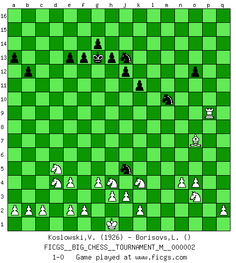 Last move : 1-0 2009 December 3 20:41:35 [Event "FICGS__BIG_CHESS__TOURNAMENT_M__000002"] [Site "FICGS"] [Date "2009.04.14"] [Round "1"] [White "Koslowski,Volker"] [Black "Borisovs,Leonids"] [Result "1-0"] [WhiteElo "1926"] [BlackElo ""] 1.j2-h4 n15-n13 2.h1-l4 j15-k13 3.l4-l10 h15-g13 4.l10-c10 g15-g14 5.c10-c15 d15-d14 6.c15-c7 b16-c14 7.d2-d3 m15-m13 8.n2-n4 h16-d12 9.m2-m4 o16-g9 10.p1-o3 c16-p4 11.c7-p7 p4-o3 12.p2-o3 p15-p14 13.b1-c3 g16-j15 14.k1-l3 h14-h13 15.p7-n7 f16-h14 16.n7-n13 o15-o14 17.n13-n5 l16-o13 18.q1-p1 k13-m14 19.c1-l9 m16-n16 20.n5-g11 g9-f10 21.g11-g8 p16-n15 22.l9-g13 h14-g13 23.g8-g13 f10-m4 24.p1-p8 m4-o2 25.g13-g11 k15-k14 26.p8-b8 b15-b14 27.l1-p5 n15-l14 28.m1-m13 o2-n3 29.p5-n3 d12-n3 30.o1-b13 e16-c16 31.b13-a14 c16-c15 32.a14-c12 c14-e13 33.c12-d13 a16-c16 34.m13-m5 n3-l1 35.h2-k1 l1-l2 36.d13-b11 c15-c11 37.g11-c11 c16-c11 38.b11-l2 k16-h15 39.m5-a5 c11-c15 40.b8-a8 a15-a13 41.a8-b8 e13-d15 42.a5-e5 e15-e13 43.b8-d8 h15-f14 44.e5-j5 j16-k15 45.d8-d14 b14-b13 46.l2-m3 b13-b12 47.d14-a14 n16-a16 48.a14-a16 q16-a16 49.g1-f3 a16-n16 50.j5-a5 c15-a15 51.a5-q5 q15-q13 52.k1-m2 a15-c15 53.g2-g4 n16-n7 54.q5-a5 c15-c13 55.o3-o4 n7-m7 56.a5-m5 m7-b7 57.a1-b1 m14-k13 58.m3-g8 f14-g12 59.f1-g2 d15-f14 60.f3-d4 o13-j8 61.g2-b7 j8-m5 62.l3-m5 k13-j11 63.b7-c6 k14-k13 64.m2-o3 g12-h10 65.g8-h7 o14-o13 66.c6-e8 j14-j13 67.c3-d5 j13-j12 68.e8-b11 c13-c15 69.j1-h2 l14-j13 70.e1-p1 c15-d15 71.h7-e4 f14-e12 72.p1-p14 j13-l12 73.p14-p13 o13-o12 74.p13-q13 e12-d10 75.b11-f7 l12-m10 76.q13-q16 d10-c8 77.b1-p1 c8-d6 78.f7-m13 l15-l14 79.m13-j10 d15-d10 80.p1-p15 k15-k14 81.q16-k16 k14-j14 82.k16-j16 d6-e4 83.j16-j15 j14-h14 84.d3-e4 h10-j8 85.j10-n14 f15-f13 86.n14-o13 j8-l9 87.j15-l15 j11-l12 88.l15-l14 h14-g13 89.h2-h1 l9-k7 90.p15-p14 l12-j13 91.l14-l10 d10-l10 92.o13-l10 k7-j5 93.m5-k4 k13-k12 94.p14-p9 k12-k11 95.l10-o7 1-0 Follow this game move after move (download)Winning isn't everything... but losing is nothing. (Mednis) Schach ist ein Kampf gegen den Fehler. (Johannes Herrman Zukertort) Un juego de Ajedrez es un dialogo, una conversación entre un jugador y su oponente. Cada movimiento del oponente puede contener amenazas o tropiezos, pero un jugador no se puede defender de las amenazas o tomar ventaja de los tropiezos si es que no se pregunta a sí mismo: ¿Que es lo que mi oponente va a hacer después de cada movida?. (Bruce A. Moon) Je ne crois pas en la psychologie, je crois aux bons coups. (Robert Fischer) Man is reluctant to give credit for intelligence to anyone, except his enemies. (Albert Einstein)