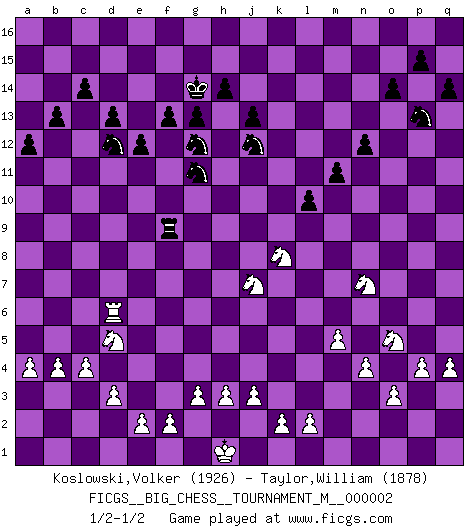 Last move : 1/2-1/2 2010 February 19 10:1:59 [Event "FICGS__BIG_CHESS__TOURNAMENT_M__000002"] [Site "FICGS"] [Date "2009.04.14"] [Round "1"] [White "Koslowski,Volker"] [Black "Taylor,William"] [Result "1/2-1/2"] [WhiteElo "1926"] [BlackElo "1878"] 1.g2-g3 j15-h13 2.h1-f3 g16-f14 3.n2-n4 p16-o14 4.f3-l8 k16-l14 5.d2-d3 h16-o10 6.p1-o3 o10-f10 7.g1-f3 d15-d13 8.l8-l3 b16-c14 9.b1-c3 m15-m13 10.m2-m4 l16-p12 11.l3-g7 n15-n14 12.l1-o4 e15-e13 13.c1-j7 f10-l10 14.k1-l3 f16-b12 15.g7-h7 l10-h7 16.o1-h7 c16-l8 17.h2-g4 l8-j6 18.h7-j6 p12-j6 19.j2-h4 j6-b13 20.f1-g2 o16-f8 21.g2-h1 f14-e12 22.h1-n6 e16-e15 23.o4-p5 h15-g13 24.h4-g6 f8-j11 25.p5-j11 h13-j11 26.j7-g9 j11-h13 27.a2-a4 b12-c13 28.g9-h10 g15-g14 29.c3-d5 j16-h15 30.n6-l8 f15-f13 31.q2-q4 k15-k13 32.q1-q3 c13-f10 33.q3-p3 q16-p16 34.p3-p9 f10-g11 35.h10-g11 e12-g11 36.p9-l9 h13-j15 37.l8-k7 a16-d16 38.g4-f6 m16-l16 39.a1-a3 c14-d12 40.a3-c3 c15-c14 41.c3-c8 l14-j13 42.c8-a8 d16-a16 43.o3-n5 l15-l13 44.l9-p9 o14-n12 45.p9-q9 q15-q14 46.q9-o9 n12-p13 47.f3-g5 l13-l12 48.k7-j6 b13-j6 49.g5-j6 b15-b14 50.l3-m5 j15-h13 51.m1-m3 g13-e12 52.m3-p3 o15-o14 53.p3-p10 l16-f16 54.f6-d7 g14-g13 55.j1-j2 h15-g14 56.e1-m1 a15-a13 57.a8-b8 b14-b13 58.d7-c9 h13-f12 59.m5-k6 j13-g12 60.o9-o7 g11-e10 61.c9-e10 f12-e10 62.b8-j8 j14-j13 63.j8-b8 d12-c10 64.b8-k8 c10-d12 65.k8-k13 f16-k16 66.k13-k10 e15-k15 67.k6-l8 p16-l16 68.k10-k15 k16-k15 69.p10-k10 l16-k16 70.o7-k7 a16-a15 71.j6-l7 e10-g11 72.l7-m9 g11-j12 73.k10-k8 k15-k8 74.k7-k8 a15-k15 75.n5-l6 l12-l11 76.k8-k15 k16-k15 77.l6-k8 m13-m12 78.m4-m5 m12-m11 79.k8-l6 k15-k9 80.m9-k8 k9-c9 81.c2-c4 c9-a9 82.b2-b3 a9-b9 83.b3-b4 b9-o9 84.o2-o3 o9-p9 85.p2-p4 p9-o9 86.l6-m4 n14-n13 87.l8-n7 o9-o7 88.m4-o5 o7-o8 89.n7-m9 o8-l8 90.k8-l6 n13-n12 91.m9-k8 l11-l10 92.g6-j7 l8-q8 93.m1-m4 e12-g11 94.m4-e4 e13-e12 95.j2-h1 q8-q9 96.e4-e6 a13-a12 97.l6-n7 q9-f9 98.e6-d6 1/2-1/2 Follow this game move after move (download)No price is too great for the scalp of the enemy King. (Koblentz) Zum Sieg gelangt man nicht, wenn man gut, sondern nur wenn man besser spielt (Savielly Grigorievitsch Tartakower) Si pudieramos observar el interior de la cabeza de un jugador de Ajedrez, encontraríamos ahí un mundo lleno de sentimientos, imágenes, ideas, emoción y pasión. (Alfred Binet) La vérité est comme le meilleur coup aux échecs : elle existe, mais il faut la chercher. (Arturo Perez-Reverte) Secret operations are essential in war; upon them the army relies to make its every move. (Sun Tzu)