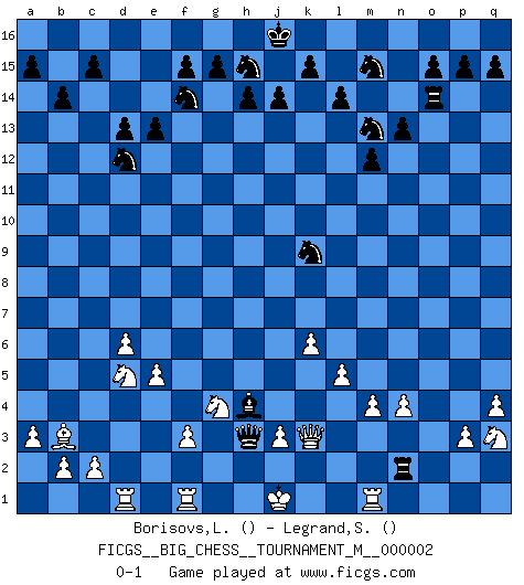 Last move : 0-1 2009 May 15 21:25:28 [Event "FICGS__BIG_CHESS__TOURNAMENT_M__000002"] [Site "FICGS"] [Date "2009.04.14"] [Round "1"] [White "Borisovs,Leonids"] [Black "Legrand,Stephane"] [Result "0-1"] [WhiteElo ""] [BlackElo ""] 1.d2-d4 e15-e13 2.e2-e4 p16-o14 3.b1-c3 j15-k13 4.p1-o3 m15-m13 5.m2-m4 d15-d13 6.n2-n4 n15-n13 7.j2-k4 f16-b12 8.l1-m2 o16-f8 9.k4-j6 h16-l13 10.l2-l4 m13-m12 11.g1-f3 l16-p12 12.l4-l5 c16-l8 13.f3-g5 e16-e14 14.f1-c4 o14-m13 15.h2-g4 b16-c14 16.m2-f8 l13-f8 17.f2-f3 l8-j6 18.o1-j6 p12-j6 19.g5-j6 f8-d6 20.j1-j2 d6-j6 21.q1-n1 m16-m14 22.n1-n3 k13-l11 23.k1-l3 m14-k14 24.h1-l1 e14-g14 25.l3-j4 g14-g9 26.k2-k3 a16-d16 27.l1-l4 j6-d6 28.c1-e3 k16-m15 29.e4-e5 d6-c7 30.c4-b5 l15-l14 31.l4-b13 b15-b14 32.a1-d1 k14-k11 33.d4-d5 b12-a11 34.k3-k4 c14-d12 35.b13-l4 g16-f14 36.d5-d6 c7-a5 37.b5-c4 k11-j11 38.a2-a3 d16-d14 39.c3-d5 d14-c14 40.c4-b3 a11-b10 41.k4-k5 c14-c10 42.k5-k6 c10-p10 43.p2-p3 p10-o10 44.e3-j7 g9-o9 45.m1-m3 l11-k9 46.j7-d2 a5-a11 47.h3-h4 j11-o11 48.l4-k3 q16-n16 49.d2-p13 o11-o13 50.p13-q12 o10-o12 51.q12-p11 a11-p11 52.j4-k2 o12-o10 53.k2-m1 p11-q11 54.q2-q4 n16-n14 55.o3-p5 o9-o2 56.m1-o2 q11-g2 57.j2-j1 o10-o2 58.n3-n1 o2-n2 59.m3-m1 o13-o2 60.n1-n2 o2-n2 61.e1-f1 g2-g3 62.j1-k1 n14-o14 63.p5-q3 g3-h3 64.k1-j1 b10-h4 0-1 Follow this game move after move (download)Chess holds its master in its own bonds, shackling the mind and brain so that the inner freedom of the very strongest must suffer. (Albert Einstein) Ein Isolani verdüstert die Stimmung auf dem ganzen Schachbrett. (Savielly Grigorievitsch Tartakower) Yo creo que el Ajedrez posee una magia que es también una ayuda en la edad avanzada. Una rodilla reumática es olvidada durante una partida de Ajedrez y otros eventos pueden parecer algo sin importancia comparada a una catástrofe en el tablero de Ajedrez. (Vlastimil Hort) On a dit que l'homme se distingue de l'animal par le fait qu'il achète plus de livres qu'il ne peut en lire. Je voudrais suggérer qu'inclure à la liste des livres quelques livres d'échecs rendrait la distinction manifeste. (Edward Lasker) Now you put water in a cup, it becomes the cup; You put water into a bottle it becomes the bottle; You put it in a teapot it becomes the teapot. Water can flow or it can crash. Be water, my friend. (Bruce Lee)