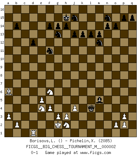 Last move : 0-1 2009 June 3 21:9:8 [Event "FICGS__BIG_CHESS__TOURNAMENT_M__000002"] [Site "FICGS"] [Date "2009.04.14"] [Round "1"] [White "Borisovs,Leonids"] [Black "Pichelin,Xavier"] [Result "0-1"] [WhiteElo ""] [BlackElo "2085"] 1.d2-d4 j15-k13 2.p1-o3 g15-g14 3.g1-f3 b15-b14 4.m2-m4 c16-b15 5.j2-k4 e15-e14 6.k1-l3 f16-c13 7.l1-o4 d15-d14 8.g2-g3 m15-m13 9.e2-e4 l16-o13 10.b1-c3 n15-n14 11.f1-b5 l15-l14 12.n2-n4 o16-f8 13.l3-m5 h16-m12 14.c1-e3 o15-o14 15.o1-l4 g16-j15 16.h1-k3 f15-f14 17.a1-d1 b16-d15 18.a2-a3 l14-l13 19.e3-f4 m16-m14 20.h2-g4 m14-k14 21.f4-e5 m12-n11 22.q1-n1 k13-m12 23.j1-h2 p16-n15 24.k3-e8 c13-b12 25.l2-l3 q16-l16 26.e5-c7 j14-j13 27.l4-b13 a16-d16 28.b13-d15 d16-d15 29.e8-a12 c15-c14 30.a12-a15 b12-a13 31.o4-d14 e16-a16 32.a15-a16 b15-a16 33.d14-p3 h15-g13 34.e4-e5 o13-c2 35.d1-c1 n11-m11 36.g4-f6 c14-c13 37.k4-j6 k14-k2 38.h2-g1 m11-j8 39.f3-h4 d15-d4 40.m5-l7 j8-n12 41.l7-k5 a16-k7 42.j3-j4 c2-j8 43.c1-d1 d4-d13 44.m4-m5 k7-j6 45.h4-j6 n12-n7 46.g1-f1 n7-c7 47.d1-d13 e14-d13 48.m1-k1 k2-k1 49.n1-k1 k15-k13 50.o3-m4 k16-j14 51.l3-l4 j16-h15 52.f6-d5 c7-c8 53.f1-g2 j8-h9 54.e1-c1 c8-b7 55.k1-d1 l16-e16 56.f2-f4 e16-e12 57.g2-h2 b7-n7 58.k5-m6 f8-k4 59.j6-k4 a13-k4 60.h2-g2 k4-m6 61.d5-f6 m6-p3 62.q2-p3 n7-n4 63.m4-k3 n4-l2 64.k3-h2 l2-l4 65.d1-d13 e12-d12 66.d13-d12 c13-d12 67.c1-d1 g13-f11 68.b5-a6 j14-g13 69.c3-e4 h9-m5 0-1 Follow this game move after move (download)Life is like a game of Chess, changing with each move. (Chinese proverb) Computer sind die einzigen Gegner, die nicht immer eine Ausrede auf Lager haben, wenn sie gegen mich verlieren. (Robert James Fischer) Ciertamente el estado mental actual de Bobby Fischer es una tragedia. Uno de los mas grandes jugadores de Ajedrez del mundo -el orgullo y pena del Ajedrez Americano. (Frank Brady) Même si vous avez un bon coup à faire, regardez toujours s'il n'y en a pas un qui lui soit préférable. (Pedro Damiano) If things go wrong, don't go with them. (Roger Babson)