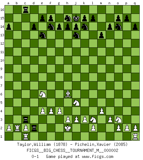 Last move : 0-1 2009 August 6 15:3:14 [Event "FICGS__BIG_CHESS__TOURNAMENT_M__000002"] [Site "FICGS"] [Date "2009.04.14"] [Round "1"] [White "Taylor,William"] [Black "Pichelin,Xavier"] [Result "0-1"] [WhiteElo "1878"] [BlackElo "2085"] 1.j2-h4 g15-g14 2.h1-o7 n15-n14 3.o7-l7 j15-l14 4.l7-c15 d15-d14 5.c15-c8 b16-c14 6.k1-l3 h16-d12 7.p1-o3 c16-g12 8.c8-f5 c14-e13 9.m2-m3 o16-g9 10.m3-m4 d12-d9 11.h2-j4 a16-c16 12.b1-c3 f16-g15 13.l1-p5 g15-f14 14.p5-f14 g16-f14 15.n2-n3 a15-a14 16.e2-e4 m15-m13 17.f1-b5 l16-m15 18.o1-f9 p16-o14 19.d2-d3 q15-q14 20.g2-g3 c16-c11 21.c1-h6 c11-f11 22.f5-d7 d9-d7 23.b5-d7 l14-j13 24.f9-m15 k16-m15 25.f2-f4 f11-b11 26.a1-b1 e16-c16 27.g1-f3 j16-j15 28.j1-h2 m15-k14 29.g3-g4 c16-c7 30.f3-e5 m16-c16 31.j4-g5 g12-d9 32.k2-k3 g9-h8 33.h4-g6 d9-g6 34.g5-e6 c7-a7 35.e5-g6 h8-c3 36.b2-c3 b11-b1 37.e1-b1 a7-d7 38.b1-b15 c16-c3 39.m1-c1 q16-c16 40.b15-b2 d7-d3 41.g6-j5 d3-d2 0-1 Follow this game move after move (download)A good sacrifice is one that is not necessarily sound but leaves your opponent dazed and confused. (Rudolph Spielmann) Das Schachspiel hat wie die Liebe, die Musik, die Fähigkeit, den Menschen glücklich zu machen. Ich habe ein leises Gefühl des Bedauerns für jeden, der das Schachspiel nicht kennt, so wie ich jeden bedaure, der die Liebe nicht kennt. (Siegbert Tarrasch) El sobresalir en el Ajedrez es un signo de una mente intrigante. (Sir Arthur Conan Doyle) L'attaque fait le spectacle, la défense gagne les matchs. (Dicton footballistique) Luck never gives; it only lends. (Swedish proverb)