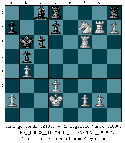 Last move : 1-0 2009 April 21 23:51:56 [Event "FICGS__CHESS__THEMATIC_TOURNAMENT__000077"] [Site "FICGS"] [Date "2009.04.14"] [Round "1"] [White "Domingo,Jordi"] [Black "Roncagliolo,Marco"] [Result "1-0"] [WhiteElo "2181"] [BlackElo "1800"] 1.e4 e5 2.Nf3 f5 3.Nxe5 Qf6 4.Nc4 fxe4 5.Nc3 Qg6 6.d3 Bb4 7.Bd2 Bxc3 8.Bxc3 Nf6 9.Bxf6 gxf6 10.Ne3 c6 11.dxe4 Qxe4 12.Qd6 Qe6 13.O-O-O Qxd6 14.Rxd6 Rf8 15.Bd3 Rf7 16.Nf5 Rf8 17.Re1+ Kd8 18.Re7 Kc7 19.Rxh7 b5 20.h4 Na6 21.h5 Nc5 22.h6 Ba6 23.b4 Nxd3+ 24.cxd3 Rad8 25.Rg7 Bc8 26.h7 Rde8 27.Kd2 Rh8 28.Rxf6 Kb6 29.Nd6 Rd8 30.Nf7 1-0 Latvian counter-gambit Queenside Castling by player White (move 13) Player White won this chess game. Follow this game move after move (download)I'm not a materialistic person, in that, I don't suffer the lack or loss of money. The absence of worldly goods I don't look back on. For Chess is a way I can be as materialistic as I want without having to sell my soul. (Jamie Walter Adams) Wie ich sie so einen nach dem anderen nieder mähte wurde meine Überlegenheit offensichtlich. (José Raúl Capablanca) Vive, pierde y aprende al observar a tu oponente como ganar. (Amber Steenbock) D'abord les bases : Jouez et étudiez, puis étudiez et jouez, ensuite jouez et étudiez, puis étudiez et jouez. Deuxièmement : Donnez toujours le meilleur de vous-même ! (Ken Smith) If you have any trouble condescending, find a Unix user to show you how it's done. (Scott Adams)
