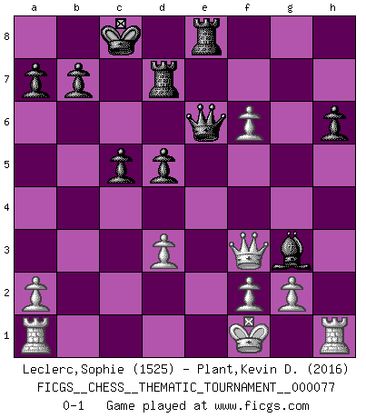 Last move : 0-1 2009 October 10 20:44:36 [Event "FICGS__CHESS__THEMATIC_TOURNAMENT__000077"] [Site "FICGS"] [Date "2009.04.14"] [Round "1"] [White "Leclerc,Sophie"] [Black "Plant,Kevin D."] [Result "0-1"] [WhiteElo "1525"] [BlackElo "2016"] 1.e4 e5 2.Nf3 f5 3.Nc3 fxe4 4.Nxe4 d5 5.Ng3 e4 6.Nd4 Nf6 7.d3 c5 8.Ndf5 Nc6 9.dxe4 Nxe4 10.Bd3 Qa5+ 11.Kf1 Bxf5 12.Nxf5 O-O-O 13.Bf4 g5 14.Be3 Qb6 15.h4 Qxb2 16.hxg5 Qe5 17.Nh6 Rd7 18.Ng4 Qe6 19.Nf6 Nxf6 20.gxf6 Ne5 21.Bg5 Nxd3 22.cxd3 h6 23.Bh4 Bd6 24.Qf3 Re8 25.Bg3 Bxg3 0-1 Latvian counter-gambit Queenside Castling by player Black (move 12) Player Black won this chess game. Follow this game move after move (download)When your house is on fire, you can't be bothered with the neighbors. Or, as we say in Chess, if your King is under attack you don't worry about losing a Pawn on the Queen's side. (Gary Kasparov) Wer nie einen Fehler gemacht hat, hat nie etwas Neues ausprobiert. (Albert Einstein) El Ajedrez es un juego de pelea el cual es puramente intelectual e incluye la suerte. (Richard Reti) Les échecs sont un jeu par leur forme, un art par leur essence et une science par sa difficulté d'acquisition. Ils peuvent vous procurer autant de plaisir qu'un bon livre ou une belle musique, mais vous n'aurez une réelle joie que si vous arrivez à bien jouer. (Tigran Petrosian) Wisdom is the reward you get for a lifetime of listening when you'd have preferred to talk. (Doug Larson)