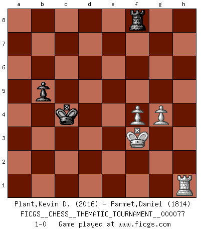 Last move : 1-0 2009 November 2 16:49:37 [Event "FICGS__CHESS__THEMATIC_TOURNAMENT__000077"] [Site "FICGS"] [Date "2009.04.14"] [Round "1"] [White "Plant,Kevin D."] [Black "Parmet,Daniel"] [Result "1-0"] [WhiteElo "2016"] [BlackElo "1814"] 1.e4 e5 2.Nf3 f5 3.Bc4 fxe4 4.Nxe5 d5 5.Qh5+ g6 6.Nxg6 Nf6 7.Qe5+ Be7 8.Nxe7 Qxe7 9.Qxe7+ Kxe7 10.Bf1 Nc6 11.b3 Be6 12.Bb2 Nb4 13.Na3 Rag8 14.f3 exf3 15.gxf3 Bf5 16.Kf2 Rg6 17.Rg1 Rxg1 18.Kxg1 c6 19.Kf2 Kf7 20.Bc3 a5 21.Be5 b5 22.d4 Ra8 23.Ke2 Nd7 24.Bd6 Ke6 25.Bg3 Bxc2 26.Nxc2 Nxc2 27.Bh3+ Ke7 28.Rc1 Nxd4+ 29.Ke3 c5 30.Bxd7 Kxd7 31.Rxc5 Nf5+ 32.Kd3 Rf8 33.f4 a4 34.Rxd5+ Kc6 35.Re5 Nxg3 36.hxg3 axb3 37.axb3 Rg8 38.Re3 Kd5 39.Ke2 Kd4 40.Kf3 h5 41.b4 Rf8 42.Re5 Kc4 43.Rxh5 Kxb4 44.g4 Kc4 45.Rh1 1-0 Latvian : Polerio variation 10 pieces endgame at move 36 : White KRPPP , Black KRPPP WHITE : King + 1 Rook 3 Pawns BLACK : King + 1 Rook 3 Pawns 9 pieces endgame at move 37 : White KRPPP , Black KRPP WHITE : King + 1 Rook 3 Pawns BLACK : King + 1 Rook 2 Pawns 8 pieces endgame at move 43 : White KRPPP , Black KRP WHITE : King + 1 Rook 3 Pawns BLACK : King + 1 Rook 1 Pawn 7 pieces endgame at move 43 : White KRPP , Black KRP WHITE : King + 1 Rook 2 Pawns BLACK : King + 1 Rook 1 Pawn Player White won this chess game. Follow this game move after move (download)Chess is a sea in which a gnat may drink and an elephant may bathe. (Hindu proverb) Ohne Fehler kann es keine Brillanz geben. (Emanuel Lasker) Las leyes del Ajedrez no permiten una libre elección: tienes que mover quieras o no. (Emanuel Lasker) Il n'y a plus de joueurs du niveau de Jacob Murray dont la seule quête est le beau jeu, le plaisir de voir les pièces construire quelque chose. Sur 10 idées à la minute, 9 seront sans intérêt, la dernière s'avèrera géniale. (Christian Bauer) Never risk one's whole fortune unless supported by one's entire army. (Niccolo Machiavelli)