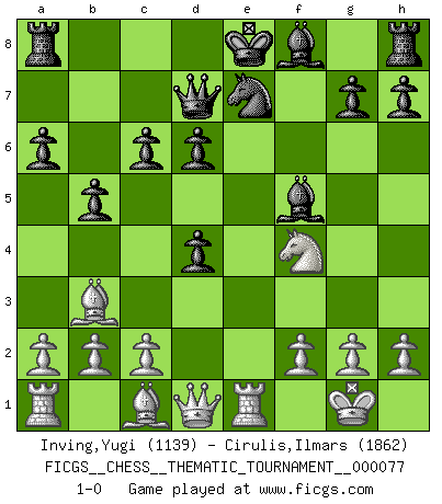 Last move : 1-0 2009 June 15 15:48:6 [Event "FICGS__CHESS__THEMATIC_TOURNAMENT__000077"] [Site "FICGS"] [Date "2009.04.14"] [Round "1"] [White "Inving,Yugi"] [Black "Cirulis,Ilmars"] [Result "1-0"] [WhiteElo "1139"] [BlackElo "1862"] 1.e4 e5 2.Nf3 f5 3.Nc3 Nc6 4.exf5 d6 5.Bb5 Bxf5 6.d4 Nge7 7.O-O a6 8.Ba4 b5 9.Bb3 Nxd4 10.Nxd4 exd4 11.Nd5 c6 12.Nf4 Qd7 13.Re1 1-0 Latvian counter-gambit Kingside Castling by player White (move 7) Player White won this chess game. Follow this game move after move (download)Morphy was probably the greatest genius of them all. (Bobby Fischer) Gewöhnliche Menschen denken nur daran, wie sie ihre Zeit verbringen. Ein intelligenter Mensch versucht, sie auszunutzen. (Arthur Schopenhauer) ¿Se han dado cuenta de que Fischer casi nunca ha tenido piezas malas? El las intercambia y las piezas malas se quedan con sus oponenets. (Yuri Balashov) Le jeu d'échecs fait naître et fortifie en nous plusieurs qualités précieuses dans le cours de l'existence, telles que la prévoyance, la circonspection, la prudence, et la persévérance. (Benjamin Franklin - 1783, la morale des échecs) I can't decide which is riskier; taking crazy risks, or taking advice on crazy risks from a crazy risk taker. (Gregory House in House M.D.)