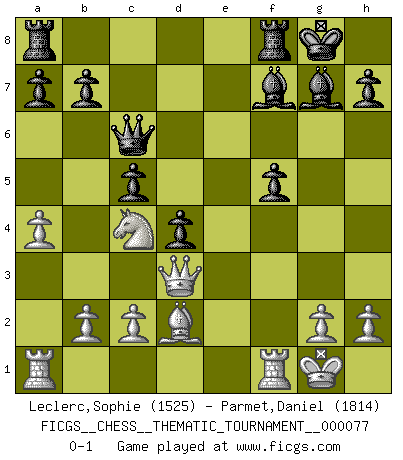 Last move : 0-1 2009 June 28 22:11:31 [Event "FICGS__CHESS__THEMATIC_TOURNAMENT__000077"] [Site "FICGS"] [Date "2009.04.14"] [Round "1"] [White "Leclerc,Sophie"] [Black "Parmet,Daniel"] [Result "0-1"] [WhiteElo "1525"] [BlackElo "1814"] 1.e4 e5 2.Nf3 f5 3.Nc3 fxe4 4.Nxe4 d5 5.Ng3 e4 6.Nd4 Nf6 7.Bb5+ c6 8.Be2 c5 9.Ndf5 g6 10.Ne3 Nc6 11.d3 exd3 12.Qxd3 Bg7 13.O-O O-O 14.f4 Be6 15.f5 Bf7 16.a4 Qe7 17.Qa3 d4 18.Nc4 Nb4 19.Qb3 Ne4 20.Nxe4 Qxe4 21.Bd3 Qc6 22.Bd2 Nxd3 23.Qxd3 gxf5 0-1 Latvian counter-gambit Kingside Castling by player White (move 13) Kingside Castling by player Black (move 13) Player Black won this chess game. Follow this game move after move (download)Chess is like war on a board. (Bobby Fischer) Spielt Blackmar-Diemer-Gambit, und das Matt kommt von selbst! (Emil Joseph Diemer) No hay otro maestro que tenga una voluntad terrífica de ganar. Al tablero, el irradía peligro y aún los oponentes mas fuertes tienden a congelarse como liebres cuando olfatean a una pantera. Aún sus debilidades son peligrosas. Con las blancas, su juego de apertura es predecible - te es posible hacer planes en su contra - pero es tan fuerte que tus planes casi nunca funcionan. En el juego medio, su precisión e invención son fabulosas y en finales, tú simplemente no le puedes vencer. (Experto Alemán anónimo) Horreur, mais aussi harmonie suprême : qu'y avait-il en effet au monde en dehors des échecs ? Le brouillard, l'inconnu, le non-être... (Vladimir Nabokov) You cannot beat a roulette table unless you steal money from it. (Albert Einstein)