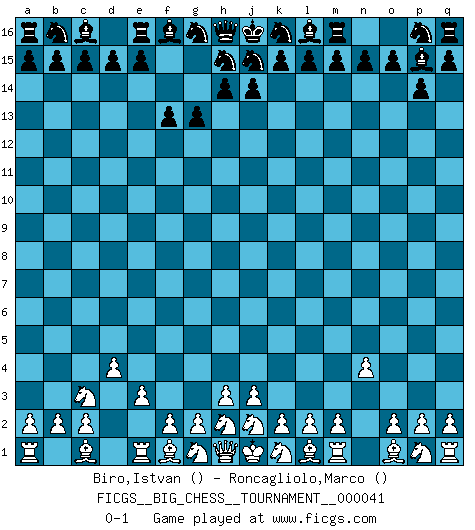 Last move : 0-1 2009 April 26 9:55:37 [Event "FICGS__BIG_CHESS__TOURNAMENT__000041"] [Site "FICGS"] [Date "2009.04.15"] [Round "1"] [White "Biro,Istvan"] [Black "Roncagliolo,Marco"] [Result "0-1"] [WhiteElo ""] [BlackElo ""] 1.b1-c3 p15-p14 2.e2-e3 o16-p15 3.d2-d4 g15-g13 4.n2-n4 f15-f13 0-1 Follow this game move after move (download)Strategy requires thought, tactics require observation. (Max Euwe) Die Arbeit ist etwas Unnatürliches. Die Faulheit allein ist göttlich. (Anatole France) El Ajedrez es un invernadero donde los frutos del carácter pueden madurar mas completamente que en la vida. (Edward Morgan Foster) La tactique est l'élément le plus important du milieu de jeu. (Siegbert Tarrasch) Players are not good because they find tactics, it is about the way to find the positions in which those tactics are hidden. (Luc-Olivier Leclerc)