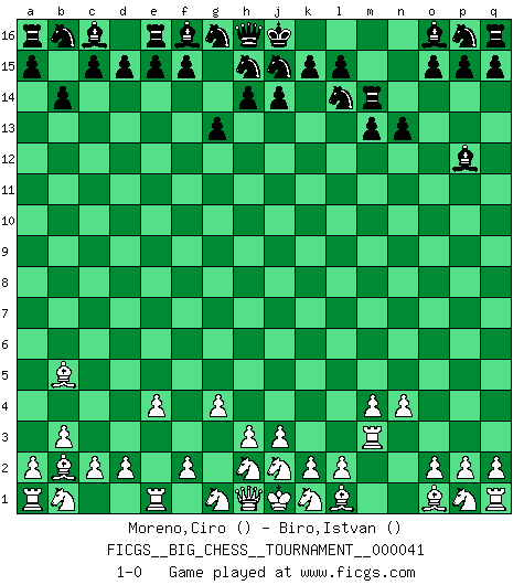 Last move : 1-0 2009 April 26 9:55:32 [Event "FICGS__BIG_CHESS__TOURNAMENT__000041"] [Site "FICGS"] [Date "2009.04.15"] [Round "1"] [White "Moreno,Ciro"] [Black "Biro,Istvan"] [Result "1-0"] [WhiteElo ""] [BlackElo ""] 1.m2-m4 g15-g13 2.n2-n4 m15-m13 3.g2-g4 l16-p12 4.b2-b3 b15-b14 5.c1-b2 k16-l14 6.e2-e4 n15-n13 7.f1-b5 m16-m14 8.m1-m3 1-0 Follow this game move after move (download)Chess problems demand from the composer the same virtues that characterize all worthwhile art: originality, invention, conciseness, harmony, complexity, and splendid insincerity. (Vladimir Nabokov) Ich habe Putins Aufstieg an die Macht beobachtet und seine Politik, die demokratischen Institutionen meines Landes zu zerstören. (Garry Kasparov) Las Aperturas te enseñan aperturas. ¡Los Finales te enseñan Ajedrez!. (Stephan Gerzadowicz) Ne tendez aucun piège pour le plaisir ! Ne jouez rien dans l'espoir que l'adversaire réagisse de façon stupide ! Prenez toujours pour acquis que l'adversaire va trouver le meilleur coup ! Ne jouez jamais de coup dans l'espoir que l'adversaire ne voie pas la menace ! Chacun de vos coups doit améliorer la position d'une façon ou d'une autre. Programmer - an organism that turns coffee into software. (Anonymous)