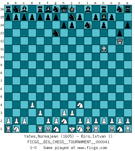 Last move : 1-0 2009 April 26 9:55:21 [Event "FICGS__BIG_CHESS__TOURNAMENT__000041"] [Site "FICGS"] [Date "2009.04.15"] [Round "1"] [White "Yates,Normajean"] [Black "Biro,Istvan"] [Result "1-0"] [WhiteElo "1605"] [BlackElo ""] 1.j2-k4 h15-g13 2.h1-l4 p15-p13 3.l4-l15 m16-n16 4.l15-l12 n15-n14 5.l12-p12 o16-n15 6.d2-d4 q15-q14 7.c1-n11 k16-l14 8.e2-e3 1-0 Follow this game move after move (download)With or without the title, Bobby Fischer was unquestionably the greatest player of his time. (Burt Hochberg) Heutzutage gewinnt im Turnier nicht derjenige Spieler, der weitreichende Pläne entwirft, sondern einfach jener, der Zug um Zug kämpft. (David Bronstein) El Ajedrez es imaginación. (David Bronstein) Les échecs, c'est la lutte contre l'erreur. (Johannes Zukertort) Chess, like love, like music, has the power to make people happy. (Siegbert Tarrasch)