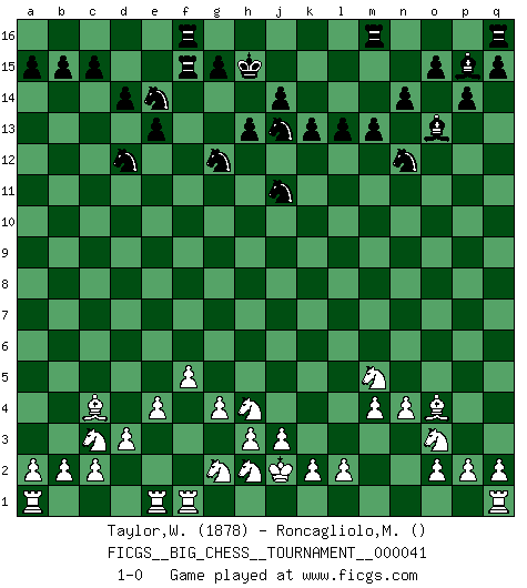 Last move : 1-0 2009 August 25 21:25:53 [Event "FICGS__BIG_CHESS__TOURNAMENT__000041"] [Site "FICGS"] [Date "2009.04.15"] [Round "1"] [White "Taylor,William"] [Black "Roncagliolo,Marco"] [Result "1-0"] [WhiteElo "1878"] [BlackElo ""] 1.j2-h4 p15-p14 2.h1-o7 p16-o14 3.o7-f15 g16-f14 4.f15-l10 k16-l14 5.m2-m4 d15-d14 6.g1-f3 o16-p15 7.b1-c3 b16-c14 8.e2-e4 c16-g12 9.f1-c4 m15-m13 10.d2-d3 l16-o13 11.l10-b10 a16-b16 12.l1-o4 e15-e13 13.p1-o3 f16-e15 14.k1-l3 h15-g13 15.c1-l9 g13-e14 16.n2-n4 n15-n14 17.o1-e10 h14-h13 18.e10-g12 f14-g12 19.l9-e15 e16-e15 20.b10-b9 h16-h15 21.b9-h15 j16-h15 22.j1-j2 c14-d12 23.g2-g4 b16-f16 24.h4-f5 o14-n12 25.f3-h4 e15-f15 26.m1-f1 j15-k13 27.f2-f4 l14-j13 28.h4-g2 k13-j11 29.f5-h4 l15-l13 30.f4-f5 k15-k13 31.l3-m5 1-0 This big chess game has been lost on time (started : 2009.04.15 2:49:13) Follow this game move after move (download)Life is a kind of Chess, with struggle, competition, good and ill events. (Benjamin Franklin) Ein unbeabsichtigtes Patt ist der Gipfel der Dummheit. (Anonymous) El poder defensivo de una pieza clavada, solamente es imaginario. (Aaron Nimzovich) Les Echecs, c'est l'art de la guerre sans les charniers, c'est la résurrection des morts tombés au champ d'honneur, l'espoir perpétuel, la suprématie de l'intelligence sur la force, la culture de l'esprit. (F. Szpiner) The real voyage of discovery consists not in seeking new lands but in seeing with new eyes. (Marcel Proust)
