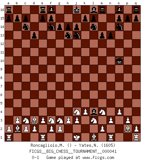 Last move : 0-1 2009 April 19 23:14:7 [Event "FICGS__BIG_CHESS__TOURNAMENT__000041"] [Site "FICGS"] [Date "2009.04.15"] [Round "1"] [White "Roncagliolo,Marco"] [Black "Yates,Normajean"] [Result "0-1"] [WhiteElo ""] [BlackElo "1605"] 1.b1-c3 g15-g14 2.b2-b3 p16-o14 3.c1-b2 d15-d13 4.e2-e3 h15-j13 5.f1-e2 m15-m13 6.p1-o3 c16-o5 7.p2-p3 o5-l2 8.m1-n1 h16-d12 9.n2-n3 d12-n12 10.e2-d3 n12-n9 11.j2-g3 j15-h13 12.k1-l3 g16-f14 13.o3-m4 l2-d9 14.o1-p2 b16-c14 15.h1-l4 k16-l14 16.k2-k4 n15-n13 17.g1-f3 n9-o10 18.o2-o4 d9-e10 19.h2-j4 e10-l4 0-1 Follow this game move after move (download)Could we look into the head of a Chess player, we should see there a whole world of feelings, images, ideas, emotion and passion. (Alfred Binet) Es hat in meinem Leben Zeiten gegeben, in denen das Schachspiel, wenn nicht zum Lebenszweck, so doch zu einem regelrechten Lebensersatz geworden ist. Man fühlt sich in solchen Zeiten nicht so, als besäße man eine göttliche Gabe, sondern eher so, als sei man von ihr besessen. (Garry Kasparov) EL Ajedrez es como la vida. (Boris Spassky) Si rien de grave n'est détecté lors de l'analyse d'une position, on joue alors le coup. Seconde règle de Blumenfeld. Remember : Your focus determines your reality. (Qui-Gon Jinn in Star Wars ep.1)
