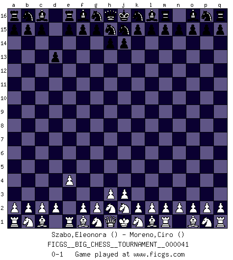 Last move : 0-1 2009 April 21 16:39:55 [Event "FICGS__BIG_CHESS__TOURNAMENT__000041"] [Site "FICGS"] [Date "2009.04.15"] [Round "1"] [White "Szabo,Eleonora"] [Black "Moreno,Ciro"] [Result "0-1"] [WhiteElo ""] [BlackElo ""] 1.e2-e4 d15-d13 0-1 Follow this game move after move (download)I look one move ahead... the best ! (Siegbert Tarrasch) Im Leben werden Partien nie so unstrittig gewonnen wie im Spiel (Emanuel Lasker) A través de las casillas del tablero, los Indios explican el movimiento del tiempo y la edad, las influencias mas altas que controlan el mundo y los lazos que vinculan al Ajedrez con el alma humana. (Al-Masudi) Aucun coup ne doit être joué sans but. (Pedro Damiano) Mac users swear by their computers. PC users swear at their computers. (Author unknown)
