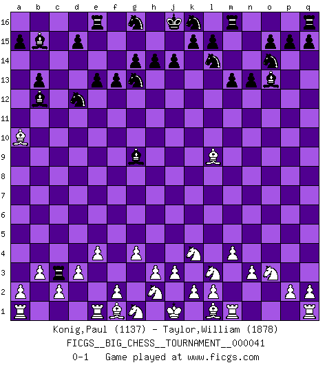 Last move : 0-1 2009 July 14 20:13:26 [Event "FICGS__BIG_CHESS__TOURNAMENT__000041"] [Site "FICGS"] [Date "2009.04.15"] [Round "1"] [White "Konig,Paul"] [Black "Taylor,William"] [Result "0-1"] [WhiteElo "1137"] [BlackElo "1878"] 1.j2-k4 g15-g14 2.h1-o7 p16-o14 3.o7-c7 j15-l14 4.c7-c15 h16-o10 5.c15-c5 o10-o2 6.p1-o3 o2-e11 7.e2-e3 n15-n13 8.c5-d4 b16-c14 9.m2-m4 e15-e13 10.d4-d5 m15-m13 11.b2-b3 o16-g9 12.n2-n3 f16-b12 13.o1-c12 h15-g13 14.k1-l3 f15-f13 15.b1-c3 e11-d12 16.d5-d12 c14-d12 17.g2-g4 l16-o13 18.d2-d3 b15-b13 19.c12-d13 a16-b16 20.e3-e4 c16-b15 21.d13-a10 b16-c16 22.c1-l9 c16-c3 0-1 Follow this game move after move (download)In a gambit you give up a Pawn for the sake of getting a lost game. (Samuel Standige Boden) Wenn du auf das Glück wartest, wird das Leben ziemlich langweilig. (Mikhail Nekhemyevich Tal) Juega la Apertura como un libro, el Juego Medio como un mago y los Finales como una máquina. (Spielmann) Demandez au pauvre Cg1 ce qu'il en pense. Eduard Gufeld à propos de la variante Saemisch de l'Est-Indienne. Shallow men believe in luck. Strong men belive in cause and effect. (Ralph Waldo Emerson)