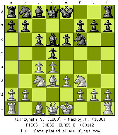 Last move : 1-0 2009 May 29 18:49:57 [Event "FICGS__CHESS__CLASS_C__000112"] [Site "FICGS"] [Date "2009.04.16"] [Round "1"] [White "Klarzynski,Slawomir"] [Black "Mackoy,Travis"] [Result "1-0"] [WhiteElo "1800"] [BlackElo "1638"] 1.d4 d5 2.c4 e6 3.Nf3 Nf6 4.Nc3 c6 5.e3 Bd6 6.Bd3 1-0 This chess game has been lost on time (started : 2009.04.16 0:32:45) Queen's gambit declined Player White won this chess game. Follow this game move after move (download)I played Chess with him and would have beaten him sometimes only he always took back his last move, and ran the game out differently. (Mark Twain) Wie gewinnt Tal? Er entwickelt alle seine Figuren in die Brettmitte und opfert sie dann irgendwo. (Robert James Fischer) En el Ajedrez, tal como es jugado por los Maestros, practicamente la suerte es eliminada. (Emanuel Lasker) Ne tendez aucun piège pour le plaisir ! Ne jouez rien dans l'espoir que l'adversaire réagisse de façon stupide ! Prenez toujours pour acquis que l'adversaire va trouver le meilleur coup ! Ne jouez jamais de coup dans l'espoir que l'adversaire ne voie pas la menace ! Chacun de vos coups doit améliorer la position d'une façon ou d'une autre. If you are going through hell, keep going. (Winston Churchill)