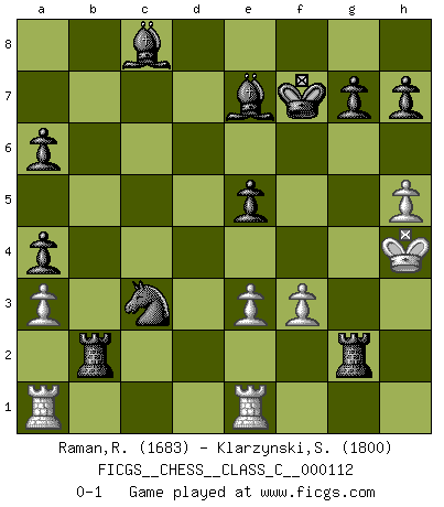 Last move : 0-1 2009 May 19 13:39:20 [Event "FICGS__CHESS__CLASS_C__000112"] [Site "FICGS"] [Date "2009.04.16"] [Round "1"] [White "Raman,Ranganathan"] [Black "Klarzynski,Slawomir"] [Result "0-1"] [WhiteElo "1683"] [BlackElo "1800"] 1.Nc3 d5 2.d4 Nf6 3.f3 c5 4.e3 a6 5.dxc5 e5 6.b4 Nc6 7.Nge2 Nxb4 8.Bd2 Bxc5 9.Na4 Bd6 10.Nec3 d4 11.Bc4 dxc3 12.Bxc3 b5 13.Bxf7+ Kxf7 14.O-O bxa4 15.Bxb4 Bxb4 16.Rb1 Qxd1 17.Rfxd1 Bc5 18.Re1 Nd5 19.Kf2 Nc3 20.Ra1 Rd8 21.h3 Rd2+ 22.Kg3 Rb8 23.h4 Rxc2 24.a3 R8b2 25.h5 Rxg2+ 26.Kh4 Be7+ 0-1 Dunst (Sleipner, Heinrichsen) Opening Kingside Castling by player White (move 14) Player Black won this chess game. Follow this game move after move (download)Chess is the gymnasium of the mind. (Blaise Pascal) Jeder Schachmeister war einmal ein Anfänger. (Irving Chernev) Un buen jugador siempre tiene buena suerte. (José Raúl Capablanca) Des idées, des idées, j'en ai cent, j'en ai mille. Des bonnes, des mauvaises, applicables, irréalisables... Il suffit de faire le tri ! (Roos) Nothing is more important for teaching us to understand the concepts we have than constructing fictitious ones. (Ludwig Wittgenstein)