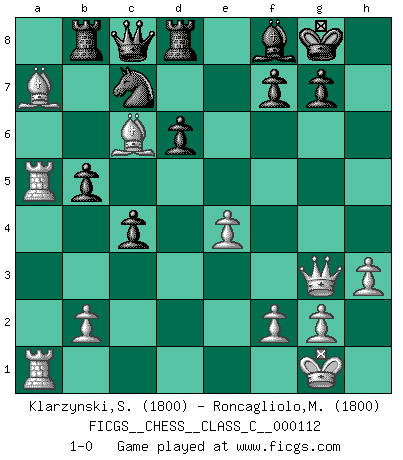 Last move : 1-0 2009 May 15 19:25:20 [Event "FICGS__CHESS__CLASS_C__000112"] [Site "FICGS"] [Date "2009.04.16"] [Round "1"] [White "Klarzynski,Slawomir"] [Black "Roncagliolo,Marco"] [Result "1-0"] [WhiteElo "1800"] [BlackElo "1800"] 1.e4 e5 2.Nf3 Nc6 3.Bb5 a6 4.Ba4 Nf6 5.O-O Be7 6.Re1 b5 7.Bb3 O-O 8.a4 Rb8 9.axb5 axb5 10.c3 d6 11.d4 exd4 12.cxd4 Bg4 13.Nc3 Re8 14.Be3 h6 15.Nd5 Bf8 16.h3 Bxf3 17.Qxf3 Nxd5 18.Bxd5 Qd7 19.Bb3 Nd8 20.Ra6 c5 21.Bd5 c4 22.Qg3 Ne6 23.Bxh6 Nxd4 24.Be3 Ne6 25.Bc6 Qc8 26.Rea1 Rd8 27.Ba7 Nc7 28.R6a5 1-0 Ruy Lopez : Closed, 7...O-O Kingside Castling by player White (move 5) Kingside Castling by player Black (move 7) Player White won this chess game. Follow this game move after move (download)Tactics flow from a superior position. (Bobby Fischer) Modernes Schach sorgt sich zuviel um Dinge wie Bauernstruktur usw. Vergessen Sie das, Schachmatt beendet das Spiel! (Nigel Short) Tu eres para mi la Reina en d8 y yo soy el Peón en d7!!. (GM Eduard Gufeld) Dans le domaine de la peinture, de la gravure et de la sculpture, dès la première décennie de notre siècle, les artistes abandonnent la représentation de la partie d'échecs pour se concentrer sur les pièces, sur les échiquiers et sur toutes les variations auxquelles les unes et les autres peuvent donner lieu. On passe en quelque sorte d'un thème social à un thème musical (au sens de la musica médiévale, c'est-à-dire d'une notion qui inclue le rythme, l'harmonie, la construction et la déconstruction, etc.). Graphiquement et picturalement, l'échiquier apparaît comme une structure ouverte, dynamique, d'une richesse infinie, autorisant toutes les combinatoires et débouchant sur des mouvements et des rythmes de nature exponentielle. (Michel Pastoureau) Establishing goals is all right if you don't let them deprive you of interesting detours. (Doug Larson)