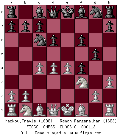 Last move : 0-1 2009 May 28 18:48:4 [Event "FICGS__CHESS__CLASS_C__000112"] [Site "FICGS"] [Date "2009.04.16"] [Round "1"] [White "Mackoy,Travis"] [Black "Raman,Ranganathan"] [Result "0-1"] [WhiteElo "1638"] [BlackElo "1683"] 1.e4 e5 2.f4 exf4 3.Nf3 Nc6 4.d4 g5 5.h3 d6 6.c4 f6 0-1 This chess game has been lost on time (started : 2009.04.16 0:32:45) King's knight's gambit Player Black won this chess game. Follow this game move after move (download)You need not play well - just help your opponent to play badly. (Genrikh Chepukaitis) Wenn man heute mit 14 Jahren noch kein GM ist, kann man es vergessen. (Viswanathan Anand) No existe un remordimiento como el remordimiento del Ajedrez. (H. G. Wells) Ce n'est pas pour s'amuser qu'il joue aux échecs : il célèbre un culte. (Vladimir Nabokov) Bobby never cared about money, though. His only desire was to prove that his choices were correct: He wanted chess to be important because he was a chess player, and he wanted to be important. Bobby knew money was important, but he didn't have a clue why, outside of clothes and status. The only way he could accomplish what he wanted was to fight for a lot of money. Once he got it, he gave it away. He did not know how to spend it. And once he'd become champion, after, essentially, sacrificing his life for it, he didn't know how to spend his time. (Bob Wade)
