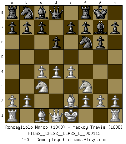 Last move : 1-0 2009 May 28 6:46:45 [Event "FICGS__CHESS__CLASS_C__000112"] [Site "FICGS"] [Date "2009.04.16"] [Round "1"] [White "Roncagliolo,Marco"] [Black "Mackoy,Travis"] [Result "1-0"] [WhiteElo "1800"] [BlackElo "1638"] 1.e4 g6 2.d4 Bg7 3.c4 d6 4.Nc3 Nf6 5.Nf3 O-O 6.Be2 1-0 This chess game has been lost on time (started : 2009.04.16 0:32:45) Robatsch (Modern) defense Kingside Castling by player Black (move 5) Player White won this chess game. Follow this game move after move (download)Of Chess it has been said that life is not long enough for it, but that is the fault of life, not Chess. (William Ewart Napier) Konzentriere dich auf materielle Gewinne. Nimm, was dir dein Gegner gibt, ausser es gibt einen guten Grund der dagegenspricht. (Robert James Fischer) En posiciones complicadas, Bobby Fischer pocas veces tuvo que temer de cualquiera. (Paul Keres) Votre prénom est 'Tactique', votre deuxième prénom est 'Tactique' et votre nom est 'Tactique'. (Ken Smith) That's absurd. I love it. (Gregory House, House M.D.)