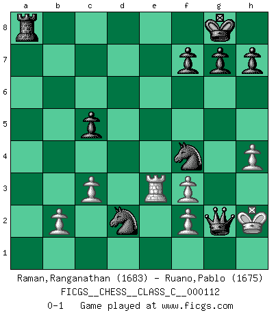 Last move : 0-1 2009 September 16 9:57:42 [Event "FICGS__CHESS__CLASS_C__000112"] [Site "FICGS"] [Date "2009.04.16"] [Round "1"] [White "Raman,Ranganathan"] [Black "Ruano,Pablo"] [Result "0-1"] [WhiteElo "1683"] [BlackElo "1675"] 1.e4 c5 2.Bc4 Nf6 3.d3 e6 4.Nh3 d5 5.Bb3 dxe4 6.O-O exd3 7.Ba4+ Nc6 8.c3 e5 9.Nd2 Bf5 10.Ng5 Be7 11.Qb3 O-O 12.Qxb7 Na5 13.Qa6 Bc8 14.Qb5 a6 15.Rb1 axb5 16.Bxb5 Bb7 17.Re1 Qd5 18.Ngf3 Qxa2 19.Rxe5 Bd6 20.Re1 Bxf3 21.gxf3 Qd5 22.Nf1 Nb3 23.Be3 Rfb8 24.Bxd3 Qxd3 25.Rbd1 Qg6+ 26.Ng3 Rd8 27.Kg2 Nh5 28.Rg1 Bf4 29.Rge1 Rxd1 30.Rxd1 Bxe3 31.Re1 Qc2 32.Rxe3 Nf4+ 33.Kg1 Qc1+ 34.Nf1 Nd2 35.h4 Qxf1+ 36.Kh2 Qg2+ 0-1 Sicilian defense Kingside Castling by player White (move 6) Kingside Castling by player Black (move 11) Player Black won this chess game. Follow this game move after move (download)The passion for playing Chess is one of the most unaccountable in the world. (H.G. Wells) Ja, jede Frau in Holland liebt mich bestimmt, und alle Männer hassen mich. (Loek van Wely) Bobby es el jugador de Ajedrez mas fino que este país jamás haya producido. Su memoria para las movidas, su brillantez en soñar combinaciones y su feróz determinación por la victoria son algo extraño. (John Collins) Plusieurs personnes se sont demandées comment Tal faisait pour gagner... En fait, c'est très simple ! Il met ses pièces au centre de l'échiquier et les sacrifie quelque part ! (David Bronstein) Computer Science is no more about computers than astronomy is about telescopes. (Edsger W. Dijkstra)