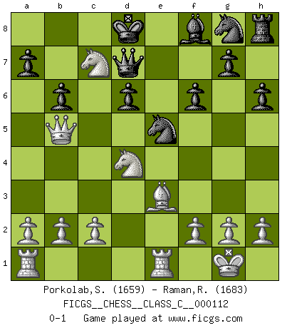Last move : 0-1 2009 August 16 8:44:38 [Event "FICGS__CHESS__CLASS_C__000112"] [Site "FICGS"] [Date "2009.04.16"] [Round "1"] [White "Porkolab,Sandor"] [Black "Raman,Ranganathan"] [Result "0-1"] [WhiteElo "1659"] [BlackElo "1683"] 1.d4 e6 2.e4 b6 3.Bd3 Bb7 4.Nf3 h6 5.Qe2 d6 6.O-O Nd7 7.Nc3 Qe7 8.Ba6 Bc8 9.Bxc8 Rxc8 10.Re1 c6 11.Qa6 Rc7 12.d5 f6 13.Be3 exd5 14.exd5 Ne5 15.dxc6 Rxc6 16.Nd4 Rc7 17.Nd5 Qf7 18.Qb5+ Qd7 19.Nxc7+ Kd8 0-1 This chess game has been lost on time (started : 2009.04.16 0:32:45) Queen's pawn Kingside Castling by player White (move 6) Player Black won this chess game. Follow this game move after move (download)You cannot play at Chess if you are kind-hearted. (French Proverb) Wenn ich Weiß habe gewinne ich weil ich Weiß habe, wenn ich Schwarz habe gewinne ich weil ich Bogoljubov bin. (Efim Bogoljubov) Si el ingenio solamente fuese necesario para lucirse, las mujeres serían las mejores jugadoras de Ajedrez del mundo. (Albin) Echiquier : carré parfait, comme la Jérusalem nouvelle décrite par l'auteur de l'Apocalypse, huit cases sur huit, exaltation du chiffre 4, symbole du cosmos aux quatre horizons... où le noir et le blanc, l'ombre et la lumière, le mal et le bien s'entremêlent et se conjuguent. (Robert Couffignal, Le Gambit du poète) Pushing plastic is for the many, pushing virtual pieces is for the fewer, pushing wood is for the very few. (Normajean Yates)