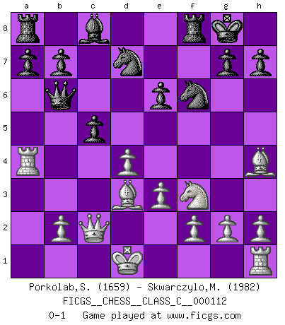 Last move : 0-1 2009 July 27 11:21:11 [Event "FICGS__CHESS__CLASS_C__000112"] [Site "FICGS"] [Date "2009.04.16"] [Round "1"] [White "Porkolab,Sandor"] [Black "Skwarczylo,Marek"] [Result "0-1"] [WhiteElo "1659"] [BlackElo "1982"] 1.d4 d5 2.c4 e6 3.Nc3 Nf6 4.Nf3 Nbd7 5.Bg5 c6 6.e3 Qa5 7.cxd5 Ne4 8.dxe6 fxe6 9.Bh4 Bb4 10.Qc1 Nxc3 11.a3 Ne4 12.axb4 Qxb4+ 13.Kd1 O-O 14.Qc2 Nef6 15.Bd3 c5 16.Ra4 Qb6 0-1 This chess game has been lost on time (started : 2009.04.16 0:32:45) QGD : 4.Nf3 Kingside Castling by player Black (move 13) Player Black won this chess game. Follow this game move after move (download)The King is a fighting piece. Use it ! (Wilhelm Steinitz) Der zweitbeste Zug ist oft der einzig richtige. (Savielly Grigorievitsch Tartakower) Yo no creo en la psicología. Yo creo en las buenas movidas. (Bobby Fischer) Le profane ne songe pas à la somme de jouissance dont il se prive, qui méconnaît ce jeu aux ressources aussi variées que passionnantes. (Jean-Marie Jeanton-Lamarche) Men never do evil so completely and cheerfully as when they do it from religious conviction. (Blaise Pascal)