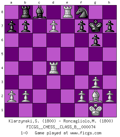 Last move : 1-0 2009 May 16 19:5:4 [Event "FICGS__CHESS__CLASS_B__000074"] [Site "FICGS"] [Date "2009.04.17"] [Round "1"] [White "Klarzynski,Slawomir"] [Black "Roncagliolo,Marco"] [Result "1-0"] [WhiteElo "1800"] [BlackElo "1800"] 1.d4 Nf6 2.c4 g6 3.g3 Bg7 4.Nf3 O-O 5.Bg2 d5 6.cxd5 Nxd5 7.O-O c6 8.Nc3 Nd7 9.e4 Nc7 10.Be3 e5 11.d5 cxd5 12.exd5 Na6 13.Re1 Nac5 14.Nxe5 Bxe5 15.Bxc5 Re8 16.Bd4 Bxd4 17.Qxd4 Rf8 18.d6 Qf6 19.Rad1 Qxd4 20.Rxd4 Nf6 21.Re7 Nd7 22.Nd5 Kg7 23.Nc7 Rb8 24.Ne6+ Kg8 25.Nxf8 Nxf8 26.Re8 Kg7 27.d7 1-0 King's Indian : 3.g3 Kingside Castling by player Black (move 4) Kingside Castling by player White (move 7) Player White won this chess game. Follow this game move after move (download)Chess, like love, is infectious at any age. (Flohr) Vielleicht wirkt die Aura früherer Spieler glanzvoller als die der heutigen Spieler, aber das liegt daran, dass man kein Programm wie Fritz hatte, das einem all die Löcher in ihren Partien zeigt. (Vladimir Kramnik) Bobby es el jugador de Ajedrez mas fino que este país jamás haya producido. Su memoria para las movidas, su brillantez en soñar combinaciones y su feróz determinación por la victoria son algo extraño. (John Collins) Vouloir jouer aux échecs contre soi-même est aussi paradoxal que vouloir marcher sur son ombre. (Stefan Zweig) Watch your thoughts; they become words. Watch your words; they become actions. Watch your actions; they become habits. Watch your habits; they become character. Watch your character; it becomes your destiny. (Frank Outlaw)