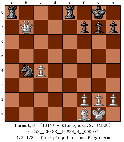 Last move : 1/2-1/2 2009 May 23 17:25:51 [Event "FICGS__CHESS__CLASS_B__000074"] [Site "FICGS"] [Date "2009.04.17"] [Round "1"] [White "Parmet,Daniel"] [Black "Klarzynski,Slawomir"] [Result "1/2-1/2"] [WhiteElo "1814"] [BlackElo "1800"] 1.e4 c5 2.b4 cxb4 3.a3 d5 4.exd5 Qxd5 5.Nf3 e5 6.c4 Qe6 7.Bb2 Nc6 8.Bd3 Nf6 9.O-O Bd6 10.Re1 O-O 11.axb4 Nxb4 12.Bf1 Rd8 13.Bxe5 Bxe5 14.Rxe5 Qd6 15.Nc3 Bg4 16.Re3 Bxf3 17.Qxf3 Qc6 18.Ne4 Nxe4 19.Rxe4 Rxd2 20.Rxa7 R2d8 21.Rxb7 Qxb7 22.Re8+ Rxe8 23.Qxb7 1/2-1/2 Sicilian : wing gambit, Marshall variation Kingside Castling by player White (move 9) Kingside Castling by player Black (move 10) This chess game ended in a draw. Follow this game move after move (download)When I asked Fischer why he had not played a certain move in our game, he replied: 'Well, you laughed when I wrote it down !' (Mikhail Tal) Ein Springer auf f6 gegen die eigene Rochadestellung ist schlimmer als ein rostiger Nagel im Knie. (Efim Bogoljubov) El Ajedrez es de 30 a 40 por ciento psicología. Uno no cuenta con esto cuando se juega contra una computadora. No lo puedo confundir. (Judith Polgar) Nous sommes les pions de la mystérieuse partie d'Echecs jouée par Dieu. Il nous déplace, nous arrête, nous pousse encore, puis nous lance un à un dans la boîte du Néant. Epitaphe sur la tombe de David Janowsky (1868-1927). The problem with troubleshooting is that trouble shoots back. (Anonymous)