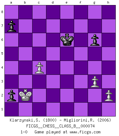 Last move : 1-0 2009 July 5 9:24:46 [Event "FICGS__CHESS__CLASS_B__000074"] [Site "FICGS"] [Date "2009.04.17"] [Round "1"] [White "Klarzynski,Slawomir"] [Black "Migliorini,Roberto"] [Result "1-0"] [WhiteElo "1800"] [BlackElo "2006"] 1.d4 Nf6 2.c4 e6 3.Nf3 b6 4.g3 Bb7 5.Bg2 Be7 6.Nc3 O-O 7.O-O Ne4 8.Qc2 Nxc3 9.Qxc3 c5 10.Rd1 d6 11.Bf4 Nc6 12.Qd2 Nxd4 13.Nxd4 Bxg2 14.Nxe6 fxe6 15.Kxg2 Qd7 16.e4 Rad8 17.Qe2 Qe8 18.Rd3 Qg6 19.Kf1 Qf7 20.b3 g5 21.Bd2 d5 22.exd5 exd5 23.cxd5 Rxd5 24.Rxd5 Qxd5 25.Kg1 Bf6 26.Re1 Bd4 27.Be3 Bxe3 28.Qxe3 g4 29.Qe5 Qxe5 30.Rxe5 Rf6 31.Rg5+ Rg6 32.Rxg6+ hxg6 33.f3 gxf3 34.Kf2 Kf7 35.Kxf3 Ke6 36.Ke4 b5 37.a4 c4 38.bxc4 bxa4 39.Kd3 a3 40.Kc3 a2 41.Kb2 1-0 Queen's Indian : Anti-Queen's Indian system Kingside Castling by player Black (move 6) Kingside Castling by player White (move 7) 10 pieces endgame at move 35 : White KPPPP , Black KPPPP WHITE : King + 4 Pawns BLACK : King + 4 Pawns 9 pieces endgame at move 38 : White KPPPP , Black KPPP WHITE : King + 4 Pawns BLACK : King + 3 Pawns 8 pieces endgame at move 38 : White KPPP , Black KPPP WHITE : King + 3 Pawns BLACK : King + 3 Pawns Player White won this chess game. Follow this game move after move (download)The sign of a great Master is his ability to win a won game quickly and painlessly. (Irving Chernev) Ein guter Spieler hat immer Glück. (José Raúl Capablanca) Tu sabes, camarada Pachman, no disfruto el ser un Ministro, preferería jugar al Ajedrez como tu. (Che Guevara) Je crois qu'il existe des manières très spécifiques de jouer efficacement contre une machine. Evidemment, nous n'avons aucune chance en technique pure, parce que l'ordinateur calcule de manière parfaite. Mais lorsque nous faisons appel à notre cerveau, en utilisant l'intuition et la compréhension, alors nous restons beaucoup plus forts. (Anatoli Karpov) All the biggest technological inventions created by man - the airplane, the automobile, the computer - says little about his intelligence, but speaks volumes about his laziness. (Mark Kennedy)