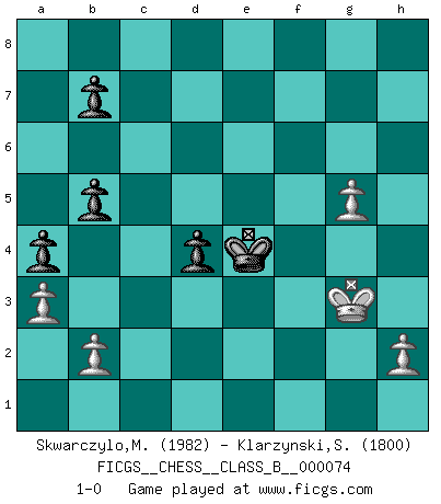 Last move : 1-0 2009 June 12 15:23:13 [Event "FICGS__CHESS__CLASS_B__000074"] [Site "FICGS"] [Date "2009.04.17"] [Round "1"] [White "Skwarczylo,Marek"] [Black "Klarzynski,Slawomir"] [Result "1-0"] [WhiteElo "1982"] [BlackElo "1800"] 1.d4 d5 2.Nf3 Nf6 3.c4 e6 4.Nc3 Bb4 5.Qa4+ Nc6 6.e3 Bd7 7.Qc2 O-O 8.Bd2 a6 9.a3 Bxc3 10.Bxc3 Ne4 11.Be2 Qe7 12.O-O f5 13.Rac1 a5 14.Rfd1 Be8 15.Be1 f4 16.cxd5 exd5 17.exf4 Rxf4 18.Ne5 Ng5 19.Nxc6 Bxc6 20.f3 Ne6 21.Bf2 Qf6 22.Qd2 Re8 23.Bf1 a4 24.Re1 Rf5 25.Re3 Rf8 26.Bd3 Rh5 27.Rce1 Nxd4 28.Re7 Nb3 29.Qb4 Rg5 30.Bg3 Nd4 31.R1e3 h5 32.f4 Rg4 33.R7e5 Rxf4 34.Bxf4 Qxf4 35.Qe1 h4 36.Rh5 Nf5 37.Rf3 Qd4+ 38.Qf2 Qxf2+ 39.Kxf2 g6 40.Rg5 Kh7 41.Bxf5 gxf5 42.R3xf5 Rxf5+ 43.Rxf5 Kg6 44.Rf4 h3 45.g3 Bb5 46.Rb4 c6 47.g4 Kf6 48.Kg3 Ke5 49.Kxh3 d4 50.Rxb5+ cxb5 51.Kg3 Ke4 52.g5 1-0 Queen's pawn game Kingside Castling by player Black (move 7) Kingside Castling by player White (move 12) 10 pieces endgame at move 50 : White KPPPP , Black KPPPP WHITE : King + 4 Pawns BLACK : King + 4 Pawns Player White won this chess game. Follow this game move after move (download)In Chess, at least, the brave inherit the earth. (Edmar Mednis) Im Hotelzimmer gab es nur zwei Schaben. (Über die Turnierbedingungen) (Peter Swidler) Todos los Maestros de Ajedrez fueron un día unos principiantes. (Chernev) Ce n'est pas pour s'amuser qu'il joue aux échecs : il célèbre un culte. (Vladimir Nabokov) Thibault, I ask for draw. Game 13876. - Sorry Ilmars, you won. (FICGS chat)