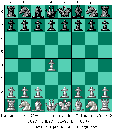 Last move : 1-0 2009 May 28 6:46:45 [Event "FICGS__CHESS__CLASS_B__000074"] [Site "FICGS"] [Date "2009.04.17"] [Round "1"] [White "Klarzynski,Slawomir"] [Black "Taghizadeh Alisaraei,Ahmad"] [Result "1-0"] [WhiteElo "1800"] [BlackElo "1800"] 1.d4 1-0 This chess game has been lost on time (started : 2009.04.17 14:50:54) Queen's pawn Player White won this chess game. Follow this game move after move (download)Chess is ruthless: you've got to be prepared to kill people. (Nigel Short) Kein Schachspieler kann gut schlafen. (H. G. Wells) Un jugador que es sorprendido, esta derrotado a medias. (Proverbio) Comme les marins qui ont mille raisons différentes d'aller en mer, les joueurs d'échecs en ont tout autant avant de s'installer devant une table et jouer... (Vincent Bertignac, philosophe) Art is the triumph over chaos. (John Cheever)