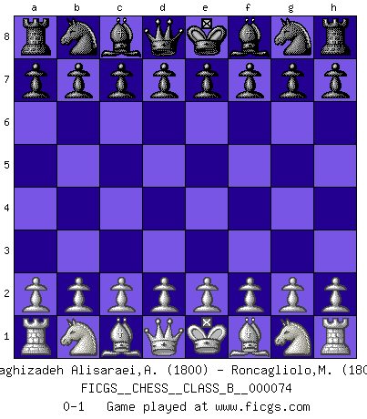 Last move : 0-1 2009 May 27 18:45:15 [Event "FICGS__CHESS__CLASS_B__000074"] [Site "FICGS"] [Date "2009.04.17"] [Round "1"] [White "Taghizadeh Alisaraei,Ahmad"] [Black "Roncagliolo,Marco"] [Result "0-1"] [WhiteElo "1800"] [BlackElo "1800"] 0-1 This chess game has been lost on time (started : 2009.04.17 14:50:54) Player Black won this chess game. Follow this game move after move (download)The older I grow, the more I value Pawns. (Keres) Die jungen Leute sollen verstehen, dass sie noch etwas von mir lernen können und müssen. (Viktor Kortschnoi) El jugador de combinación piensa hacia adelante; comienza de la posición dada y trabaja las movidas contundentes en su mente. (Emanuel Lasker) Vous n'êtes pas toujours obligé de jouer le meilleur coup. Un coup doit être actif, entreprenant, correct et beau ! (David Bronstein) Opportunities multiply as they are seized. (Sun Tzu)
