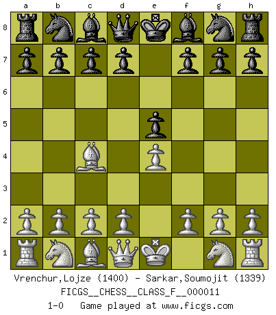 Last move : 1-0 2006 October 21 13:2:26 [Event "FICGS__CHESS__CLASS_F__000011"] [Site "FICGS"] [Date "2006.09.09"] [Round "1"] [White "Vrenchur,Lojze"] [Black "Sarkar,Soumojit"] [Result "1-0"] [WhiteElo "1400"] [BlackElo "1339"] 1.e4 e5 2.Bc4 1-0 This chess game has been lost on time (started : 2006.09.09 20:53:43) Bishop's Opening Player White won this chess game. Follow this game move after move (download)Chess is war over the board. The object is to crush the opponents mind. (Bobby Fischer) Das Blackmar-Diemer-Gambit verändert den ganzen Menschen! (Emil Joseph Diemer) No solamente yo pronostico su triunfo sobre Botvinnik, sino que me adelanto y digo que probablemente Fischer es el jugador de Ajedrez mas grande que haya existido. (John Collins) Pour moi, les échecs ne sont pas un jeu mais un art. (Alexandre Alekhine) Wisdom doesn't necessarily come with age. Sometimes age just shows up all by itself. (Tom Wilson)