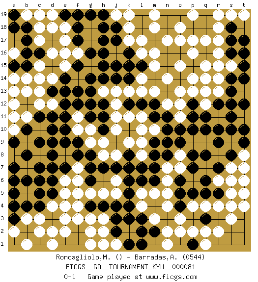 Last move : 0-1 2009 June 3 15:30:53 [Event "FICGS__GO__TOURNAMENT_KYU__000081"] [Site "FICGS"] [Date "2009.04.17"] [Round "1"] [Black "Roncagliolo,Marco"] [White "Barradas,Anderson"] [Result "0-1"] [Rating 2 "0544"] 1.k12 j13 2.h14 h13 3.h12 k13 4.g13 j12 5.g12 j11 6.l12 l13 7.g14 k11 8.m12 m13 9.j14 n12 10.m11 m10 11.n11 o11 12.n10 n9 13.o10 p10 14.o9 o8 15.m9 l10 16.n8 p9 17.p8 o7 18.p7 n7 19.m7 l11 20.n9 l9 21.m8 l8 22.o6 n6 23.m6 n5 24.o5 m5 25.l6 l5 26.k6 k7 27.j7 j6 28.k5 j8 29.h7 j5 30.k4 n4 31.j4 h5 32.h4 g5 33.g4 f4 34.k3 h8 35.g7 f7 36.g8 g9 37.f8 f6 38.f9 f10 39.e9 e8 40.e10 g10 41.e11 f11 42.f12 g3 43.e7 e6 44.d7 d8 45.d9 c8 46.c9 b9 47.g11 h9 48.c7 b7 49.b8 b6 50.d8 l4 51.p11 o12 52.q10 q9 53.q11 r9 54.b10 e15 55.a9 f16 56.d6 e5 57.g16 d16 58.f15 d14 59.e14 c15 60.p12 o13 61.f17 e16 62.f13 e17 63.k14 l14 64.d5 d4 65.d13 c13 66.l3 m3 67.m2 n2 68.l1 h3 69.j3 h2 70.l2 n1 71.o4 o3 72.p3 p2 73.l15 m15 74.q13 n14 75.q6 p4 76.q3 q4 77.q2 r4 78.p1 o2 79.r3 s3 80.s4 s5 81.r5 t4 82.q5 p6 83.p5 s4 84.s6 t7 85.s8 s7 86.r10 s9 87.r7 r8 88.s10 t8 89.t10 p14 90.t9 t5 91.q8 t6 92.s8 r6 93.p10 r2 94.s6 q1 95.r9 r6 96.r12 s6 97.s11 q14 98.g6 f5 99.e12 d12 100.e13 c12 101.h15 m16 102.k16 l17 103.j15 k17 104.j17 g17 105.f18 g18 106.h17 k18 107.g19 h18 108.j18 l16 109.k15 e18 110.h19 k19 111.e19 d18 112.c11 d19 113.f19 j19 114.h16 o15 115.b12 b13 116.a11 a13 117.c4 b5 118.d3 e4 119.b4 c3 120.c5 b3 121.a4 d2 122.a5 e3 123.a7 p16 124.c6 q15 125.a6 r14 126.h11 j10 127.l7 k9 128.b6 c2 129.s13 r13 130.s14 s15 131.t15 r16 132.s16 r15 133.t17 r17 134.s18 r18 135.t14 r19 136.t16 q17 137.s12 s19 138.s17 t19 139.t12 p13 140.j2 j1 141.o19 o18 142.p18 o17 143.n18 n17 144.q18 m18 145.n19 m19 146.h10 a12 147.a3 a2 148.b18 c17 149.b16 c18 150.b15 b14 151.b17 b19 152.c16 c14 153.a18 a14 154.a19 c19 155.a15 b11 156.d10 a10 157.d11 a11 158.pass p19 159.k1 h1 160.f2 f3 161.f1 e2 162.e1 d1 163.q3 q2 164.pass g2 165.pass g1 166.q19 p17 167.k8 q12 168.k7 q13 169.h18 b1 170.pass a16 0-1 Here are the names of the openings (joseki) played in the four corners : Corner d16 : j13 h14 This joseki is unknown. A weak or weird move has probably been played in this corner. Corner q16 : l12 l13 This joseki is unknown. A weak or weird move has probably been played in this corner. Corner q4 : n9 o9 This joseki is unknown. A weak or weird move has probably been played in this corner. Corner d4 : j7 j6 This joseki is unknown. A weak or weird move has probably been played in this corner. Player White won this Go (weiqi, baduk) game. Follow this game move after move (download)The carpenter's square becomes ko. (Anonymous) O divine art of subtlety and secrecy! Through you we learn to be invisible, through you inaudible and hence we can hold the enemy's fate in our hands. (Sun Tzu)
