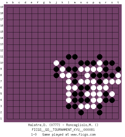 Last move : 1-0 2009 August 25 9:25:31 [Event "FICGS__GO__TOURNAMENT_KYU__000081"] [Site "FICGS"] [Date "2009.04.17"] [Round "1"] [Black "Halatre,Didier"] [White "Roncagliolo,Marco"] [Result "1-0"] [Rating 1 "0777"] 1.q3 p4 2.r5 r7 3.r10 q4 4.r4 q5 5.o6 p6 6.p8 o5 7.n5 r6 8.q7 q6 9.o4 p5 10.r8 o7 11.n6 o3 12.n4 p3 13.q2 n3 14.m3 p7 15.q8 o8 16.n10 o9 17.o10 n7 18.m7 n9 19.m9 m6 20.m5 l6 21.m8 l5 22.m4 s7 23.s8 t8 24.n2 l4 25.l3 l7 26.t9 t7 27.s10 p9 28.p10 q9 29.r9 q10 30.q11 s5 31.s4 l8 32.k10 m10 33.m11 l10 34.l9 k9 35.l11 j10 36.j9 k8 37.j8 1-0 This go game has been lost on time (started : 2009.04.17 21:37:48) Here are the names of the openings (joseki) played in the four corners : Corner q4 : q3 p4 Komoku (Somok, Xiao~mu`) 3-4 Point. The komoku (3-4) point is the traditional corner enclosure move.. Player Black won this Go (weiqi, baduk) game. Follow this game move after move (download)Play slow, win slow; play fast, lose fast. (Anonymous) Computers make it easier to do a lot of things, but most of the things they make it easier to do don't need to be done. (Andy Rooney)