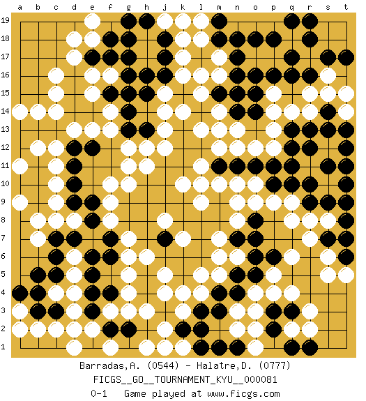 Last move : 0-1 2009 October 18 17:34:19 [Event "FICGS__GO__TOURNAMENT_KYU__000081"] [Site "FICGS"] [Date "2009.04.17"] [Round "1"] [Black "Barradas,Anderson"] [White "Halatre,Didier"] [Result "0-1"] [Rating 1 "0544"] [Rating 2 "0777"] 1.l7 d17 2.d16 c16 3.d15 c15 4.d14 c14 5.c13 d13 6.d12 e13 7.e14 f13 8.e12 f14 9.f15 f16 10.e17 e16 11.l8 c4 12.c5 d5 13.c6 d6 14.c7 c9 15.d9 d8 16.d10 c10 17.d11 c12 18.b13 b12 19.a13 b14 20.a12 a11 21.b11 a14 22.b10 c11 23.b9 b8 24.d7 c8 25.g16 e15 26.g15 j14 27.g14 h12 28.g13 g12 29.h13 j13 30.h15 j15 31.j16 k16 32.j17 k17 33.f17 e18 34.f18 d18 35.g17 h18 36.j18 h17 37.h19 k18 38.k19 l19 39.g19 j19 40.h16 k19 41.g18 e19 42.e5 f3 43.e4 d4 44.e3 d3 45.d2 c2 46.b4 e2 47.b3 b2 48.c3 d1 49.b5 b7 50.e6 d2 51.e8 g7 52.f6 g6 53.g8 g5 54.f4 g4 55.f7 f9 56.e9 f10 57.g9 g10 58.h10 g11 59.j9 f8 60.j11 j12 61.h9 q4 62.j7 j5 63.k7 l10 64.k9 k10 65.k11 l11 66.k12 l13 67.l12 m12 68.j10 l9 69.m11 m10 70.n11 n10 71.o11 o10 72.p11 r11 73.p10 p9 74.q10 q9 75.r10 s10 76.r9 r8 77.s9 s11 78.q12 p13 79.q13 q14 80.t9 s8 81.r12 s12 82.s13 r14 83.s14 s15 84.r13 p12 85.q11 n12 86.t12 o12 87.m8 o9 88.o8 q8 89.t8 t7 90.s7 s6 91.t6 r7 92.t7 s5 93.n7 t5 94.t10 t15 95.t11 t14 96.s11 j8 97.h7 m6 98.l6 l5 99.k5 k4 100.k6 n6 101.o6 p5 102.o5 o4 103.n5 m5 104.n4 n3 105.m4 l4 106.m3 o3 107.o7 m7 108.p6 q6 109.l3 k3 110.k2 j2 111.h5 h6 112.h4 h3 113.l2 n2 114.m9 n9 115.k13 k14 116.j6 j4 117.j1 h1 118.p16 p15 119.o15 o16 120.n16 o17 121.n15 m14 122.n17 o18 123.n18 n19 124.m18 l16 125.m19 o19 126.p18 p17 127.q16 q18 128.l17 l18 129.m15 l15 130.o14 p14 131.r16 s16 132.s17 r17 133.q17 p19 134.r18 n13 135.r19 m17 136.q19 m16 137.p18 r15 138.t13 k1 139.l1 j1 140.n1 o1 141.m1 a3 142.a4 a2 143.f2 g3 144.g2 f1 145.p2 o2 146.p3 p4 147.q3 r3 148.q1 r2 149.r1 q2 150.a10 a9 151.n14 m13 152.o16 n8 153.t17 h11 154.o18 h8 155.k8 j8 156.h8 j8 157.j7 k7 0-1 Here are the names of the openings (joseki) played in the four corners : Corner d16 : d17 d16 Komoku (Somok, Xiao~mu`) 3-4 Point. The komoku (3-4) point is the traditional corner enclosure move.. Corner d4 : c4 c5 Komoku (Somok, Xiao~mu`) 3-4 Point. The komoku (3-4) point is the traditional corner enclosure move.. Player White won this Go (weiqi, baduk) game. Follow this game move after move (download)Win the early ko to win the game. (Anonymous) Think like a man of action, act like a man of thought. (Henri Louis Bergson)