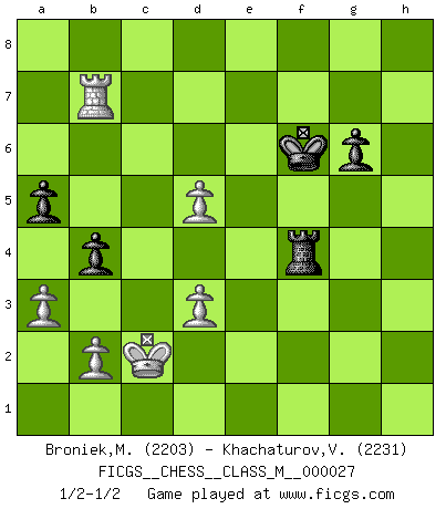Last move : 1/2-1/2 2009 October 28 22:15:16 [Event "FICGS__CHESS__CLASS_M__000027"] [Site "FICGS"] [Date "2009.04.17"] [Round "1"] [White "Broniek,Mariusz Maciej"] [Black "Khachaturov,Vadim"] [Result "1/2-1/2"] [WhiteElo "2203"] [BlackElo "2231"] 1.e4 c5 2.Nf3 d6 3.d4 cxd4 4.Nxd4 Nf6 5.Nc3 a6 6.Bg5 e6 7.f4 Be7 8.Qf3 Qc7 9.O-O-O Nbd7 10.g4 b5 11.Bxf6 Nxf6 12.g5 Nd7 13.f5 Bxg5+ 14.Kb1 O-O 15.fxe6 Nb6 16.Nd5 Nxd5 17.exd5 fxe6 18.Qg4 e5 19.Qxg5 exd4 20.Bd3 g6 21.h4 Bf5 22.h5 Bxd3 23.cxd3 Rf2 24.Rc1 Qf7 25.Rhg1 Rf6 26.Qh4 Re8 27.Qxd4 Rf8 28.hxg6 Rxg6 29.a3 a5 30.Rc6 Qf4 31.Rxg6+ hxg6 32.Qxf4 Rxf4 33.Rxd6 Kf7 34.Rb6 b4 35.Rb7+ Kf6 36.Kc2 1/2-1/2 Sicilian : Najdorf, 7...Be7 Queenside Castling by player White (move 9) Kingside Castling by player Black (move 14) This chess game ended in a draw. Follow this game move after move (download)We like to think. (Gary Kasparov) Schach ist das schnellste Spiel der Welt, weil man in jeder Sekunde Tausende von Gedanken ordnen muß. (Albert Einstein) El Ajedrez es tortura mental. (Garry Kasparov) Horreur, mais aussi harmonie suprême : qu'y avait-il en effet au monde en dehors des échecs ? Le brouillard, l'inconnu, le non-être... (Vladimir Nabokov) You can't play chess if you're groggy from pills. (Anatoly Karpov)