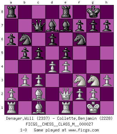 Last move : 1-0 2009 June 28 9:0:31 [Event "FICGS__CHESS__CLASS_M__000027"] [Site "FICGS"] [Date "2009.04.17"] [Round "1"] [White "Denayer,Will"] [Black "Collette,Benjamin"] [Result "1-0"] [WhiteElo "2337"] [BlackElo "2228"] 1.e4 e5 2.Nf3 Nc6 3.Bb5 a6 4.Ba4 Nf6 5.O-O Be7 6.Re1 b5 7.Bb3 d6 8.c3 O-O 9.h3 Na5 10.Bc2 c5 11.d4 Qc7 12.Nbd2 Bd7 13.Nf1 Nc4 14.Qe2 Rfe8 15.b3 Nb6 16.Ng3 1-0 Ruy Lopez : Closed Kingside Castling by player White (move 5) Kingside Castling by player Black (move 8) Player White won this chess game. Follow this game move after move (download)It was clear to me that the vulnerable point of the American Grandmaster (Bobby Fischer) was in double-edged, hanging, irrational positions, where he often failed to find a win even in a won position. (Efim Geller) Ich trinke, ich rauche, ich spiele, ich liebe Frauen aber Fernschach ist ein Laster, das ich nicht habe. (Mikhail Nekhemyevich Tal) ¿Quién es tu oponente esta tarde? Esta tarde mi oponente son las piezas negras. (Akiba Rubinstein) D'abord les bases : Jouez et étudiez, puis étudiez et jouez, ensuite jouez et étudiez, puis étudiez et jouez. Deuxièmement : Donnez toujours le meilleur de vous-même ! (Ken Smith) Treat your password like your toothbrush. Don't let anybody else use it, and get a new one every six months. (Clifford Stoll)