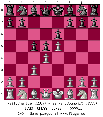 Last move : 1-0 2006 October 22 1:12:40 [Event "FICGS__CHESS__CLASS_F__000011"] [Site "FICGS"] [Date "2006.09.09"] [Round "1"] [White "Neil,Charlie"] [Black "Sarkar,Soumojit"] [Result "1-0"] [WhiteElo "1287"] [BlackElo "1339"] 1.e4 e6 2.d4 d5 3.e5 c5 4.c3 1-0 This chess game has been lost on time (started : 2006.09.09 20:53:43) French : Advance variation Player White won this chess game. Follow this game move after move (download)Of Chess it has been said that life is not long enough for it, but that is the fault of life, not Chess. (William Ewart Napier) Wenn du gegen Bobby spielst, ist es keine Frage von gewinnen oder verlieren. Es ist eine Frage des Überlebens. (Boris Vassilievich Spassky) Existen dos clases de sacrificios: los correctos y los míos. (Mikhail Tal) Toutes choses étant égales, c'est la conviction qui gagne. Alliée à une volonté de vaincre, elle sert de détonateur, suscite des idées, disperse les doutes et aide à penser clairement. (Robert Fischer) May the force be with you. (Han Solo in Star Wars ep.4)