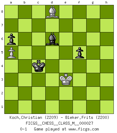 Last move : 0-1 2009 November 9 8:54:45 [Event "FICGS__CHESS__CLASS_M__000027"] [Site "FICGS"] [Date "2009.04.17"] [Round "1"] [White "Koch,Christian"] [Black "Bleker,Frits"] [Result "0-1"] [WhiteElo "2209"] [BlackElo "2200"] 1.e4 c5 2.c4 Nc6 3.Nc3 g6 4.h3 Bg7 5.g3 e6 6.Bg2 Nge7 7.d3 O-O 8.Nge2 d6 9.f4 Rb8 10.O-O a6 11.a4 Bd7 12.g4 f5 13.Rb1 Qa5 14.exf5 exf5 15.g5 Rfe8 16.Be3 Be6 17.Rc1 Bf7 18.Re1 Nb4 19.Bf2 Nec6 20.h4 h5 21.gxh6 Bxh6 22.Nd5 Nxd5 23.Bxd5 Qd8 24.d4 cxd4 25.Qb3 Qd7 26.Rcd1 Kh7 27.c5 Bxd5 28.Qxd5 Nb4 29.Qc4 dxc5 30.Qxc5 Bf8 31.Qxd4 Qxd4 32.Nxd4 Rxe1+ 33.Bxe1 Rd8 34.Rd2 Bc5 35.Bf2 Rd6 36.Kg2 Kh6 37.Kf3 Kh5 38.Be3 Nc6 39.Nxc6 Rxd2 40.Bxd2 bxc6 41.b3 Be7 42.Be3 Bxh4 43.Bb6 g5 44.fxg5 Bxg5 45.Ba5 Kg6 46.Ke2 Kf7 47.Kd3 Ke6 48.Kd4 Be7 49.Ke3 Bc5+ 50.Kf4 Bd6+ 51.Kf3 Kd5 52.Bb6 c5 53.Ke3 c4 54.bxc4+ Kxc4 55.Bd8 Kb4 56.a5 Kc4 0-1 Sicilian defense Kingside Castling by player Black (move 7) Kingside Castling by player White (move 10) 10 pieces endgame at move 44 : White KBPPP , Black KBPPP WHITE : King + 1 Bishop 3 Pawns BLACK : King + 1 Bishop 3 Pawns 9 pieces endgame at move 44 : White KBPP , Black KBPPP WHITE : King + 1 Bishop 2 Pawns BLACK : King + 1 Bishop 3 Pawns 8 pieces endgame at move 54 : White KBPP , Black KBPP WHITE : King + 1 Bishop 2 Pawns BLACK : King + 1 Bishop 2 Pawns 7 pieces endgame at move 54 : White KBP , Black KBPP WHITE : King + 1 Bishop 1 Pawn BLACK : King + 1 Bishop 2 Pawns Player Black won this chess game. Follow this game move after move (download)The way he plays Chess demonstrates a man's whole nature. (Stanley Ellin) Wenn du gegen Bobby spielst, ist es keine Frage von gewinnen oder verlieren. Es ist eine Frage des Überlebens. (Boris Vassilievich Spassky) Nos gusta pensar. (Gary Kasparov) Même un GMI sait rarement calculer sur plus de cinq coups une attaque à sacrifices. (Rudolf Spielmann) Train yourself to let go of everything you fear to lose. (Master Yoda in Star Wars ep.3)