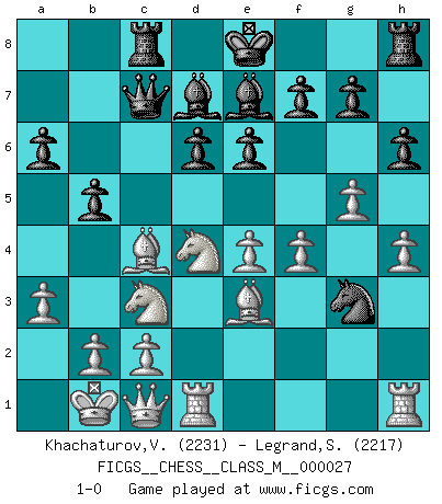Last move : 1-0 2009 August 30 9:37:49 [Event "FICGS__CHESS__CLASS_M__000027"] [Site "FICGS"] [Date "2009.04.17"] [Round "1"] [White "Khachaturov,Vadim"] [Black "Legrand,Stephane"] [Result "1-0"] [WhiteElo "2231"] [BlackElo "2217"] 1.e4 c5 2.Nf3 d6 3.d4 cxd4 4.Nxd4 Nf6 5.Nc3 Bd7 6.f3 Nc6 7.Be3 Rc8 8.Qd2 a6 9.O-O-O e6 10.g4 h6 11.h4 b5 12.Kb1 Ne5 13.a3 Be7 14.Be2 Qc7 15.g5 Nh5 16.f4 Nc4 17.Qc1 Ng3 18.Bxc4 1-0 This chess game has been lost on time (started : 2009.04.17 22:42:20) Sicilian Queenside Castling by player White (move 9) Player White won this chess game. Follow this game move after move (download)He who takes the Queen's Knight's Pawn will sleep in the streets. (Anonymous) Die Neutralität betrachte ich als eine schwere Krankheit. (Viktor Kortschnoi) Tu no necesitas jugar muy bien, únicamente ayudar a tu oponenet a que juegue muy mal. (Genrikh Chepukaitis) Il (Jacob Murray) ne joue pas pour le bon coup, mais pour le meilleur. (Eloi Relange) Man is reluctant to give credit for intelligence to anyone, except his enemies. (Albert Einstein)