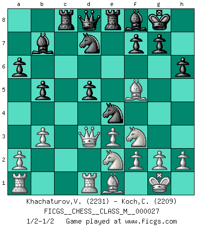 Last move : 1/2-1/2 2009 June 13 20:5:55 [Event "FICGS__CHESS__CLASS_M__000027"] [Site "FICGS"] [Date "2009.04.17"] [Round "1"] [White "Khachaturov,Vadim"] [Black "Koch,Christian"] [Result "1/2-1/2"] [WhiteElo "2231"] [BlackElo "2209"] 1.d4 d5 2.c4 e6 3.Nf3 Nf6 4.Nc3 Bb4 5.Bg5 Nbd7 6.cxd5 exd5 7.Qc2 c5 8.dxc5 h6 9.Bd2 O-O 10.e3 Bxc5 11.Bd3 a6 12.O-O b5 13.Ne2 Bb7 14.Bc3 Rc8 15.Bf5 Bd6 16.Qd3 Ne4 17.Rfd1 Re8 18.b3 Ba3 19.Be1 Bf8 1/2-1/2 Queen's gambit declined Kingside Castling by player Black (move 9) Kingside Castling by player White (move 12) This chess game ended in a draw. Follow this game move after move (download)Who is your opponent tonight, tonight I am playing against the Black pieces. (Akiba Rubinstein) Der Partner hat auch seine Existenzberechtigung. (Savielly Grigorievitsch Tartakower) Aquel que ve no otra dirección en el juego que la de dar Jaque Mate a su oponente, nunca será un buen jugador de Ajedrez. (Euwe) La vérité est comme le meilleur coup aux échecs : elle existe, mais il faut la chercher. (Arturo Perez-Reverte) The weakness of an artist is dogma. (Josh Waitzkin)