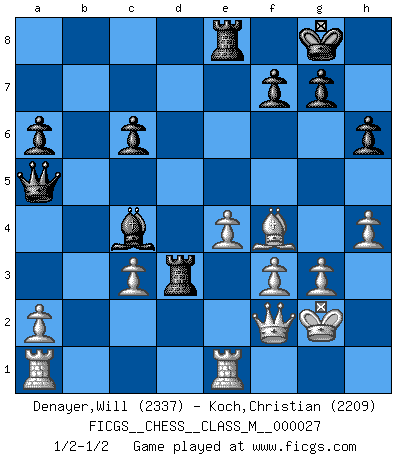 Last move : 1/2-1/2 2009 July 5 0:5:40 [Event "FICGS__CHESS__CLASS_M__000027"] [Site "FICGS"] [Date "2009.04.17"] [Round "1"] [White "Denayer,Will"] [Black "Koch,Christian"] [Result "1/2-1/2"] [WhiteElo "2337"] [BlackElo "2209"] 1.Nf3 Nf6 2.c4 e6 3.g3 d5 4.d4 Be7 5.Bg2 O-O 6.O-O dxc4 7.Ne5 Nc6 8.Bxc6 bxc6 9.Nxc6 Qe8 10.Nxe7+ Qxe7 11.Qa4 e5 12.dxe5 Qxe5 13.Qxc4 Be6 14.Qd3 Rad8 15.Qe3 Qh5 16.f3 Bc4 17.Nc3 Rfe8 18.Qf2 Nd5 19.Re1 Nxc3 20.bxc3 Qa5 21.e4 Rd3 22.Bf4 a6 23.Kg2 h6 24.h4 c6 1/2-1/2 Reti Opening Kingside Castling by player Black (move 5) Kingside Castling by player White (move 6) This chess game ended in a draw. Follow this game move after move (download)Every Chess master was once a beginner. (Chernev) Früher wurde jeder komplizierte Zug, jedes interessante Opfer mit großem Beifall und Enthusiasmus aufgenommen. Heute schaltet man einfach seinen Fritz an, und man kann sehen, was los ist, ob der Zug geht oder nicht. (Vladimir Kramnik) Personalmente, yo prefiero mirar hacia el futuro en donde un programa de computadora gane el título mundial de Ajedrez. La humanidad necesita una lección de humildad. (Richard Dawkings) Mais n'est-ce pas déjà le limiter injurieusement que d'appeler les échecs un jeu? N'est-ce pas aussi une science, un art, ou quelque chose qui, comme le cercueil de Mahomet entre ciel et terre, est suspendu entre l'un et l'autre, et qui réunit un nombre incroyable de contraires ? (Stefan Zweig) Work expands to fill the time available. (C. Northcote Parkinson, in Parkinson's Laws)