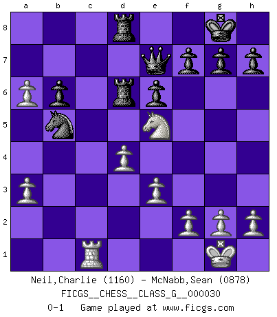 Last move : 0-1 2009 May 10 14:34:17 [Event "FICGS__CHESS__CLASS_G__000030"] [Site "FICGS"] [Date "2009.04.18"] [Round "1"] [White "Neil,Charlie"] [Black "McNabb,Sean"] [Result "0-1"] [WhiteElo "1160"] [BlackElo "0878"] 1.d4 Nf6 2.c4 e6 3.Nf3 Bb4+ 4.Nbd2 O-O 5.a3 Bxd2+ 6.Bxd2 b6 7.e3 Bb7 8.Bd3 d5 9.O-O Nc6 10.b4 dxc4 11.Bxc4 Ne4 12.Qb3 Qe7 13.Rac1 Nxd2 14.Nxd2 Rad8 15.Nf3 Qf6 16.Rfd1 Ne7 17.Ne5 a5 18.bxa5 Rd6 19.a6 Bd5 20.Bxd5 Nxd5 21.Rc6 Qe7 22.Rdc1 Rfd8 23.Rxc7 Nxc7 24.Qb5 Nxb5 0-1 Bogo-Indian defense, Gruenfeld variation Kingside Castling by player Black (move 4) Kingside Castling by player White (move 9) Player Black won this chess game. Follow this game move after move (download)If Chess is a science, it's a most inexact one. If Chess is an art, it is too exacting to be seen as one. If Chess is a sport, it's too esoteric. If Chess is a game, it's too demanding to be just a game. If Chess is a mistress, she's a demanding one. If Chess is a passion, it's a rewarding one. If Chess is life, it's a sad one. (Unknown) Der Freibauer hat für mich eine Seele, genau wie der Mensch, Wünsche, die unerkannt in ihm schlummern, und Befürchtungen, von deren Existenz er selbst kaum ahnt. (Aaron Nimzowitsch) Cuando estes solo, cuando te sientas un extraño en el mundo, juega al Ajedrez. Esto levantará tu espiritu y será tu consejero de guerra. (Aristóteles) On est toujours la mazette de quelqu'un d'autre. (Anonyme) Patience, use the Force, think ! (Obi-Wan Kenobi in Star Wars ep.2)