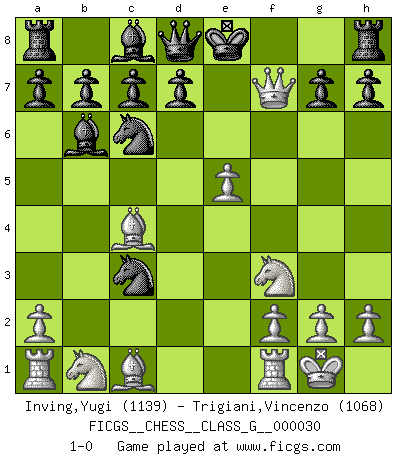 Last move : 1-0 2009 June 12 2:48:15 [Event "FICGS__CHESS__CLASS_G__000030"] [Site "FICGS"] [Date "2009.04.18"] [Round "1"] [White "Inving,Yugi"] [Black "Trigiani,Vincenzo"] [Result "1-0"] [WhiteElo "1139"] [BlackElo "1068"] 1.e4 e5 2.Bc4 Bc5 3.Nf3 Nc6 4.b4 Bxb4 5.c3 Ba5 6.O-O Nf6 7.d4 Bb6 8.dxe5 Nxe4 9.Qd5 Nxc3 10.Qxf7+ 1-0 Bishop's Opening : Classical variation Kingside Castling by player White (move 6) Player White won this chess game. Follow this game move after move (download)One bad move nullifies forty good ones. (Horowitz) Wenn du nicht weißt was du tun sollst, warte bis dein Gegner eine Idee hat. Sie wird sicher schlecht sein. (Siegbert Tarrasch) El Ajedrez es un invernadero donde los frutos del carácter pueden madurar mas completamente que en la vida. (Edward Morgan Foster) La tactique, c'est ce que vous faites quand il y a quelque chose à faire; la stratégie, c'est ce que vous faites quand il n'y a rien à faire. (Savielli Tartacower) Chess is as much a mystery as women. (Purdy)