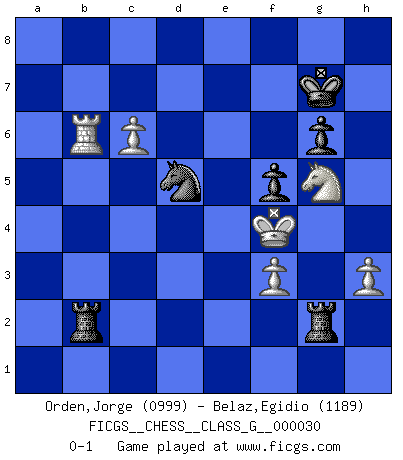 Last move : 0-1 2009 June 7 2:59:6 [Event "FICGS__CHESS__CLASS_G__000030"] [Site "FICGS"] [Date "2009.04.18"] [Round "1"] [White "Orden,Jorge"] [Black "Belaz,Egidio"] [Result "0-1"] [WhiteElo "0999"] [BlackElo "1189"] 1.e4 c5 2.Nf3 d6 3.d4 cxd4 4.Nxd4 Nf6 5.Nc3 e5 6.Nf3 Be7 7.Be2 O-O 8.O-O Nc6 9.Be3 Re8 10.a3 b6 11.h3 Bb7 12.Bd3 Qc7 13.b4 a6 14.Bg5 Na7 15.Bxf6 Bxf6 16.Re1 Qxc3 17.Qd2 Qxd2 18.Nxd2 d5 19.exd5 e4 20.Bxe4 Bxa1 21.Rxa1 Rad8 22.f3 Bxd5 23.c4 Bxe4 24.Nxe4 f5 25.Nc3 Rc8 26.Nd5 b5 27.c5 Nc6 28.a4 bxa4 29.Rxa4 Re1+ 30.Kf2 Re5 31.Nb6 Rce8 32.Nd7 Re2+ 33.Kg3 g6 34.Nf6+ Kf7 35.Nxh7 Rb2 36.Rxa6 Nxb4 37.Rb6 R8e2 38.Ng5+ Kg7 39.c6 Rxg2+ 40.Kf4 Nd5+ 0-1 Sicilian Kingside Castling by player Black (move 7) Kingside Castling by player White (move 8) Player Black won this chess game. Follow this game move after move (download)It is no time to be playing Chess when the house is on fire. (Italian Proverb) Die Partien sind immer verschieden, die Interviews immer die gleichen. (Garry Kasparov) El hombre es un frívolo, una creatura engañosa y como un jugador de Ajedrez, se preocupa mas por el proceso de obtener su meta que de la meta por sí misma. (Dostoyevsky) Ce qui caractérise les parties de combat, c'est que si le défenseur a constamment de difficiles problèmes à résoudre, l'attaquant doit chercher sans relâche de nouvelles possibilités d'attaque. (Koblentz) The next best thing to gambling and winning is gambling and loosing. (Nick Dandalos)