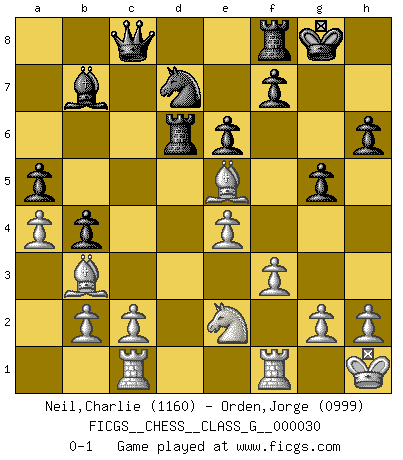 Last move : 0-1 2009 May 11 20:8:27 [Event "FICGS__CHESS__CLASS_G__000030"] [Site "FICGS"] [Date "2009.04.18"] [Round "1"] [White "Neil,Charlie"] [Black "Orden,Jorge"] [Result "0-1"] [WhiteElo "1160"] [BlackElo "0999"] 1.e4 c5 2.Nc3 Nc6 3.Nf3 d6 4.d4 cxd4 5.Nxd4 a6 6.Bc4 Nf6 7.Bb3 e6 8.O-O Be7 9.Bg5 O-O 10.Kh1 h6 11.Bh4 Qb6 12.f3 g5 13.Bf2 Qc7 14.Na4 b5 15.Nc3 Bb7 16.a4 b4 17.Nce2 Nd7 18.Rc1 a5 19.Nb5 Qc8 20.Nxd6 Bxd6 21.Qxd6 Nce5 22.Bd4 Ra6 23.Bxe5 Rxd6 0-1 Sicilian : Closed, 2...Nc6 Kingside Castling by player White (move 8) Kingside Castling by player Black (move 9) Player Black won this chess game. Follow this game move after move (download)I know people who have all the will in the world, but still can't play good Chess. (Bobby Fischer) Die Elozahlen sind sehr schlecht für das Schach. Jetzt ist Schach eine Sportindustrie, die darauf zielt Elopunkte zu machen. (Miguel Najdorf) Yo tuve un dolor de muelas en la primer partida. En el segundo juego, tuve un dolor de cabeza. En el tercero, tuve un ataque de reumatísmo. En la cuarta partida, no me sentía muy bien. ¿Y en el quinto juego? Bueno, ¿que acaso uno tiene que ganar todos los juegos?. (Siegbert Tarrasch) On n'a jamais que l'âge auquel on a commence à jouer aux échecs car après on cesse de vieillir. (Capablanca) In my experience, there's no such thing as luck. (Obi-Wan Kenobi in Star Wars ep.4)