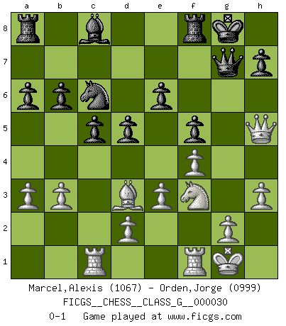 Last move : 0-1 2009 May 11 17:6:22 [Event "FICGS__CHESS__CLASS_G__000030"] [Site "FICGS"] [Date "2009.04.18"] [Round "1"] [White "Marcel,Alexis"] [Black "Orden,Jorge"] [Result "0-1"] [WhiteElo "1067"] [BlackElo "0999"] 1.f4 e6 2.Nf3 d5 3.e3 c5 4.b3 Bd6 5.Bb2 Nf6 6.Be2 O-O 7.O-O b6 8.Nc3 Nc6 9.Nb5 a6 10.Nxd6 Qxd6 11.Bxf6 gxf6 12.Qe1 Nb4 13.Qh4 Nxc2 14.Rac1 Nb4 15.Qxf6 Qd8 16.Qh6 f6 17.a3 Nc6 18.Bd3 Qe7 19.h3 Qg7 20.Qh5 f5 0-1 Bird's Opening Kingside Castling by player Black (move 6) Kingside Castling by player White (move 7) Player Black won this chess game. Follow this game move after move (download)When you don't know what to do, wait for your opponent to get an idea - it's sure to be wrong. (Tarrasch) Um dein Spiel zu verbessern musst du zuallererst das Endspiel studieren, denn diese kann unabhängig studiert werden. Die Eröffnung und das Mittelspiel müssen immer in Bezug gesetzt werden zum Endspiel. (José Raúl Capablanca) Ciertamente el estado mental actual de Bobby Fischer es una tragedia. Uno de los mas grandes jugadores de Ajedrez del mundo -el orgullo y pena del Ajedrez Americano. (Frank Brady) Si rien de grave n'est détecté lors de l'analyse d'une position, on joue alors le coup. Seconde règle de Blumenfeld. Have no fear of perfection - you'll never reach it. (Salvador Dali)