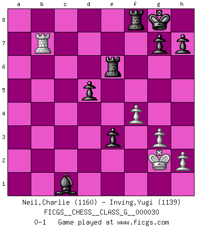 Last move : 0-1 2009 June 23 9:41:4 [Event "FICGS__CHESS__CLASS_G__000030"] [Site "FICGS"] [Date "2009.04.18"] [Round "1"] [White "Neil,Charlie"] [Black "Inving,Yugi"] [Result "0-1"] [WhiteElo "1160"] [BlackElo "1139"] 1.c4 f5 2.d4 e6 3.Nc3 d5 4.cxd5 exd5 5.g3 Nf6 6.Bg2 c6 7.Bg5 Bd6 8.e3 O-O 9.Nf3 Qb6 10.Qc2 Be6 11.O-O Ne4 12.Nd2 Nxg5 13.f4 Ne4 14.Bh3 Nxd2 15.Qxd2 Nd7 16.a3 Nf6 17.Rac1 Rae8 18.Qe2 Ne4 19.Nxe4 fxe4 20.Bxe6+ Rxe6 21.b4 a5 22.Qb2 axb4 23.axb4 Bxb4 24.Rb1 c5 25.dxc5 Bxc5 26.Rfc1 Bxe3+ 27.Kg2 Qxb2+ 28.Rxb2 Bxc1 29.Rxb7 e3 0-1 English : Anglo-Dutch defense Kingside Castling by player Black (move 8) Kingside Castling by player White (move 11) Player Black won this chess game. Follow this game move after move (download)After a bad opening, there is hope for the middle game. After a bad middle game, there is hope for the endgame. But once you are in the endgame, the moment of truth has arrived. (Edmar Mednis) Nur ein wirklich starker Spieler weiß wie schwach er spielt. (Savielly Grigorievitsch Tartakower) Es el objetivo de la escuela moderna no tratar cada posición de acuerdo a una regla general, sino de acuerdo al principio inherente en la posición. (Richard Reti) Les Echecs mettent en conflit, non pas deux intelligences, mais deux volontés. (Lasker) Memory is a complicated thing, a relative to truth, but not its twin. (Barbara Kingsolver, Animal Dreams)
