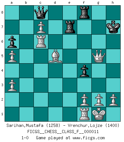 Last move : 1-0 2007 January 6 19:18:10 [Event "FICGS__CHESS__CLASS_F__000011"] [Site "FICGS"] [Date "2006.09.09"] [Round "1"] [White "Sarihan,Mustafa"] [Black "Vrenchur,Lojze"] [Result "1-0"] [WhiteElo "1258"] [BlackElo "1400"] 1.c4 e5 2.Nc3 Bc5 3.e3 Nf6 4.d4 exd4 5.exd4 Qe7+ 6.Be2 Bb4 7.Nf3 O-O 8.O-O Nc6 9.Bg5 h6 10.Bxf6 Qxf6 11.Rc1 d6 12.Nd5 Qg6 13.a3 Ba5 14.b4 Bb6 15.c5 Bh3 16.Nf4 Qg4 17.Nxh3 dxc5 18.dxc5 Ba5 19.Ne5 Qe6 20.Nxc6 Qxc6 21.bxa5 Rad8 22.Qb3 a6 23.Bf3 Qe6 24.Qxb7 g5 25.Qxc7 Rd7 26.Qg3 f5 27.c6 Re7 28.c7 Qc8 29.Bd5+ Kh7 30.Rc6 f4 31.Nxg5+ hxg5 32.Qxg5 1-0 English Opening Kingside Castling by player Black (move 7) Kingside Castling by player White (move 8) Player White won this chess game. Follow this game move after move (download)In life, as in Chess, one's own Pawns block one's way. A man's very wealth, ease, leisure, children, books, which should help him to win, more often checkmate him. (Charles Buxton) Fallen sollten polizeilich verboten werden. (Savielly Grigorievitsch Tartakower) Las Aperturas te enseñan aperturas. ¡Los Finales te enseñan Ajedrez!. (Stephan Gerzadowicz) Je menace de comprendre la position. (Anonyme) Life is the sum of all your choices. (Albert Camus)